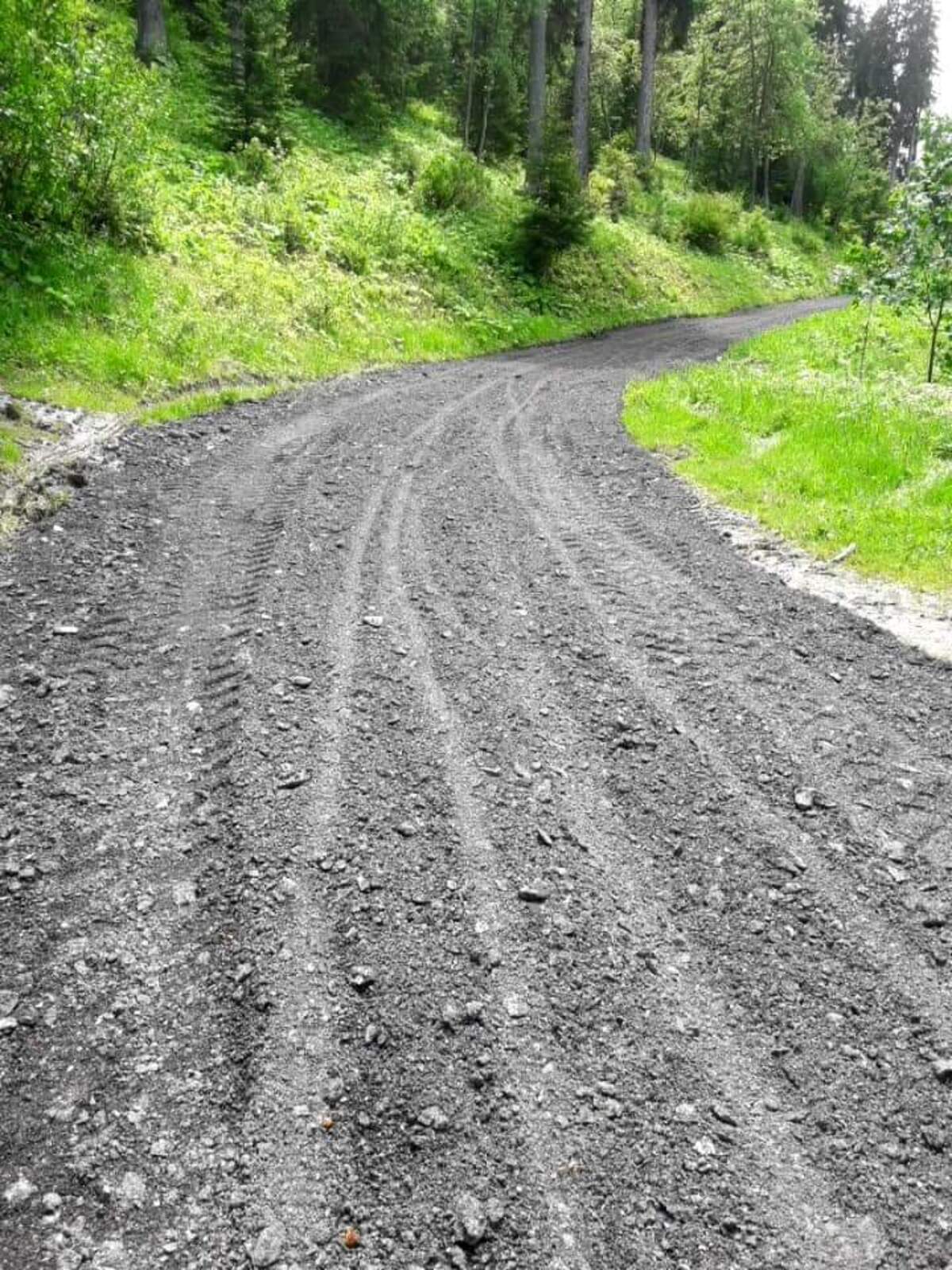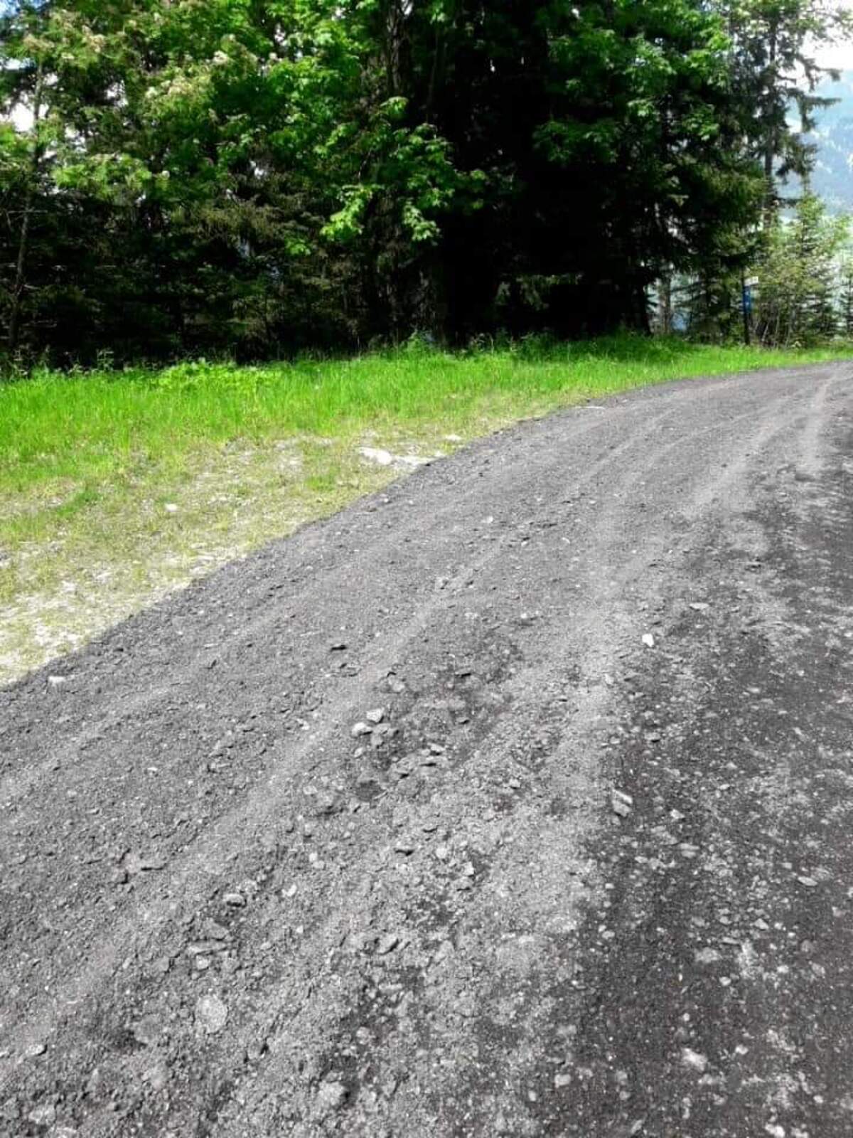 Dépôt de fraisat sur un chemin forestier sur un épaisseur de près de 10 cm et plusieurs kilomètres