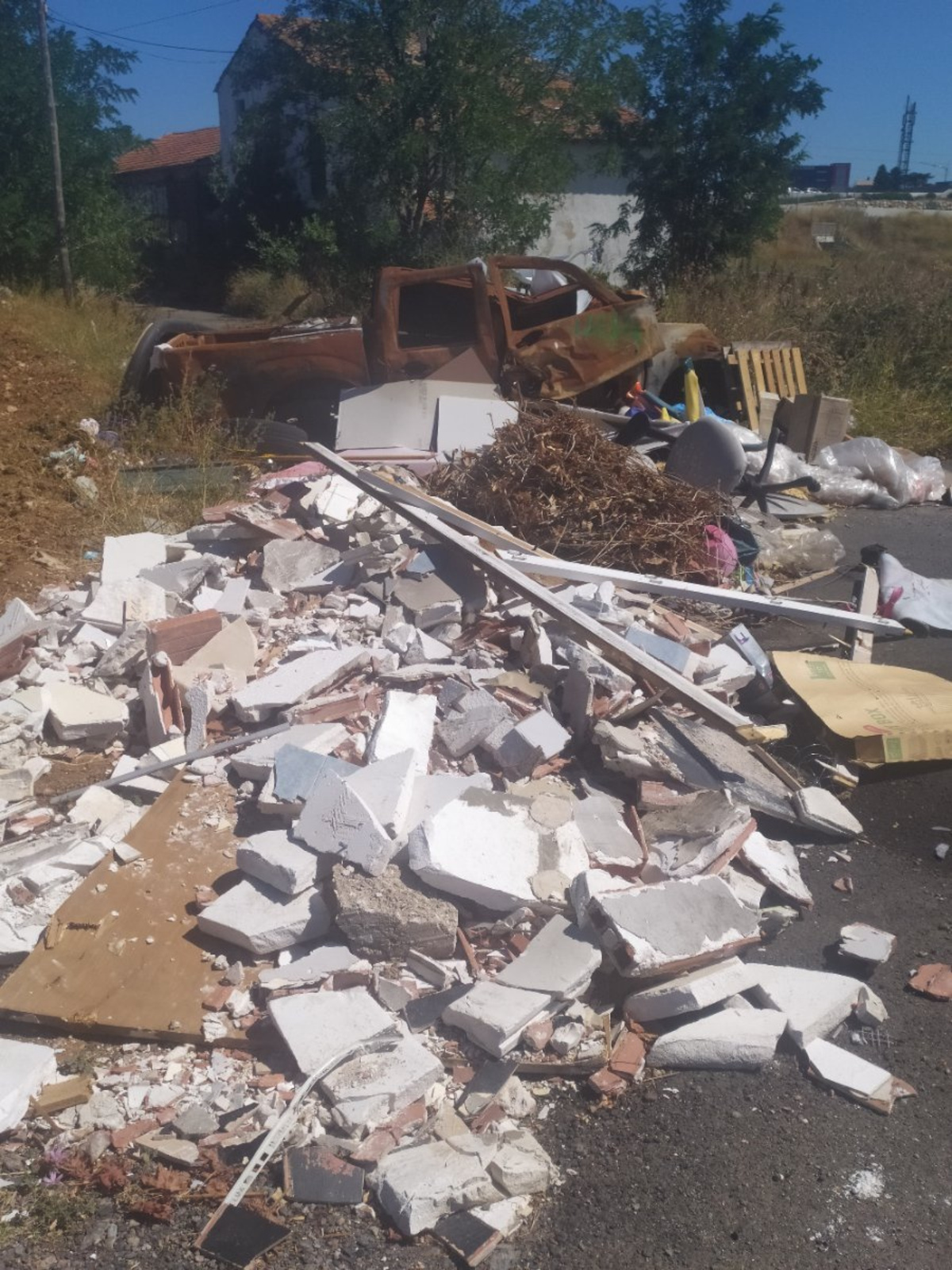 Dépôt sauvage de déchets en zone agricole.