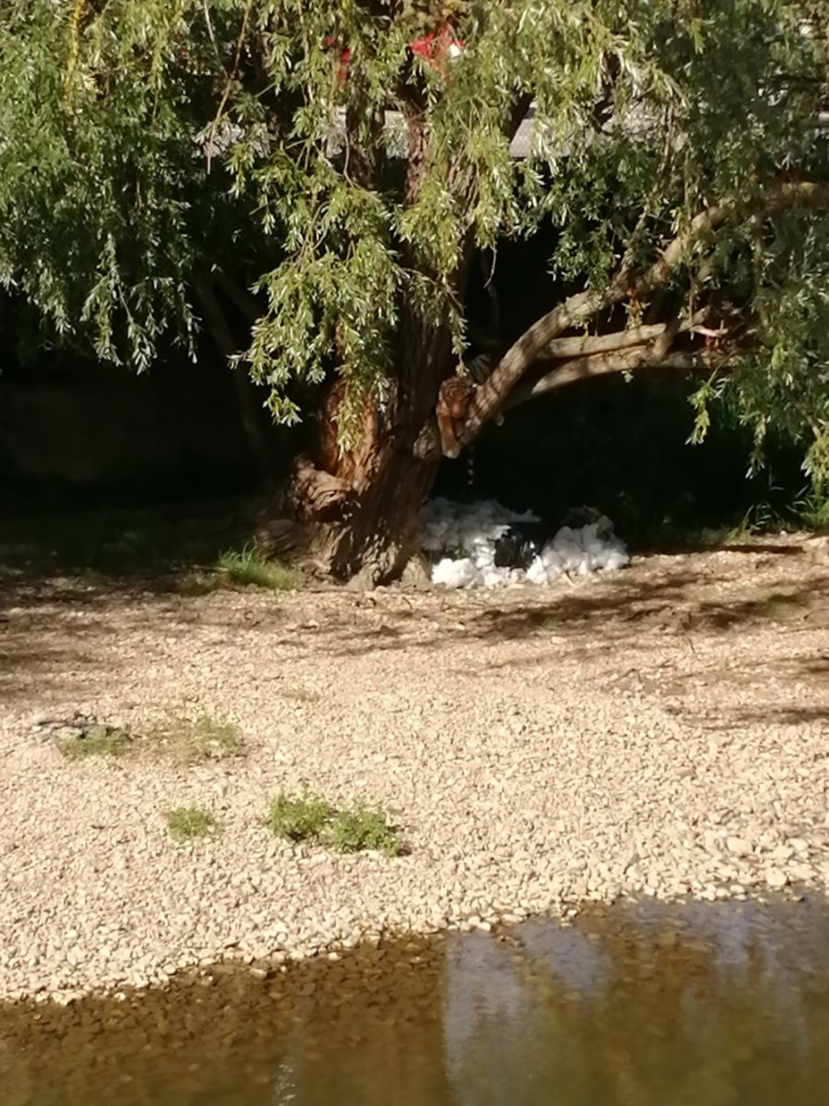 Plusieurs sacs poubelles contenant de la mousse d'ameublement ont été déposés sur la plage au bord de l'Ouche. La plupart sont éventrés et ouverts ... la mousse commence à se déverser dans l'eau.