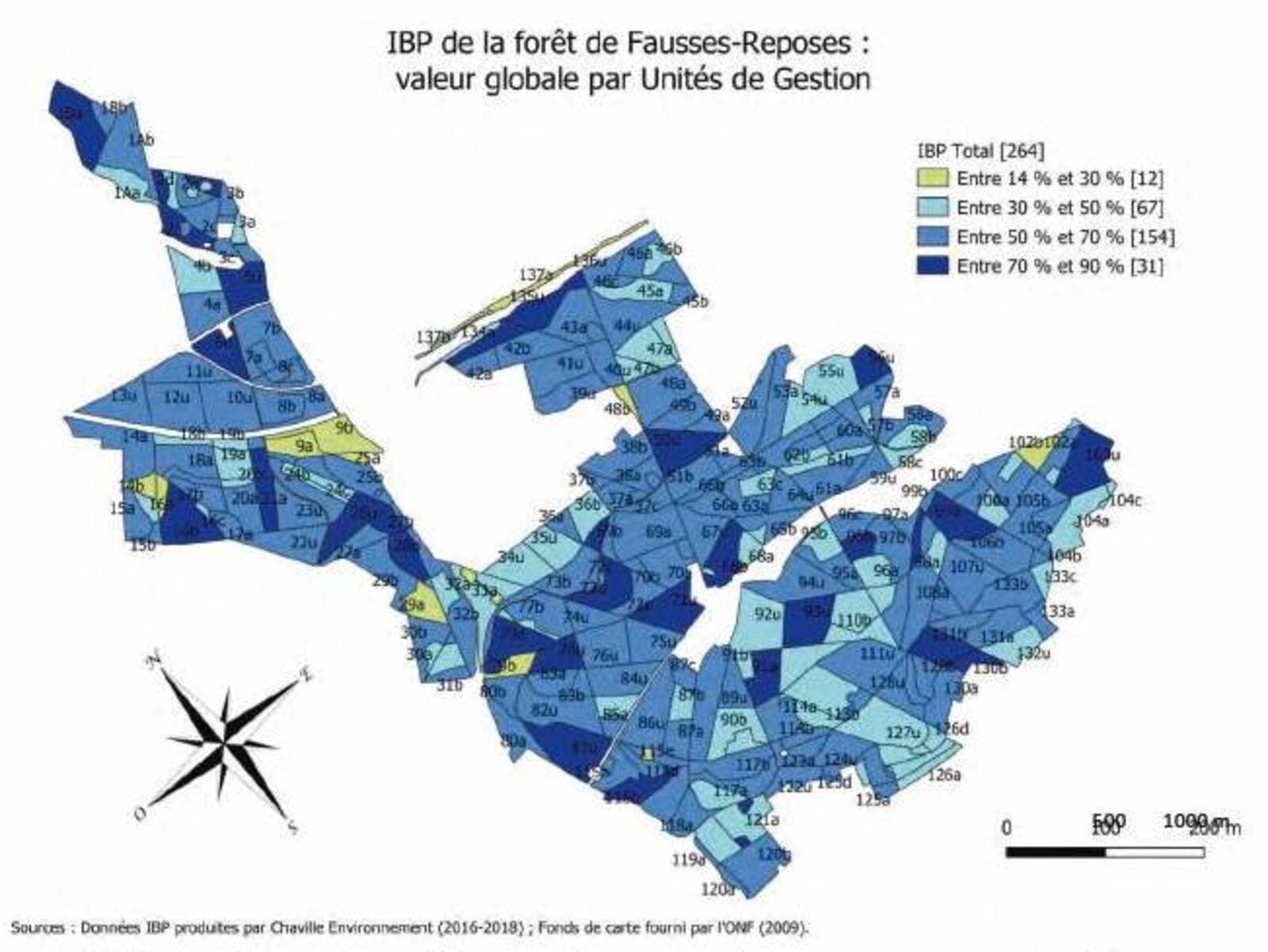 L'IBP global de la forêt de Fausses Reposes est de 56,54%, ce qui est une valeur très moyenne. Cette étude de grande ampleur a révélé que certaines parcelles ont un IBP beaucoup plus élevé que d'autres. Une parcelle qui est très exploitée ou qui a subi de gros dommages après une tempête aura un score moins élevé qu'une parcelle épargnée par la coupe.