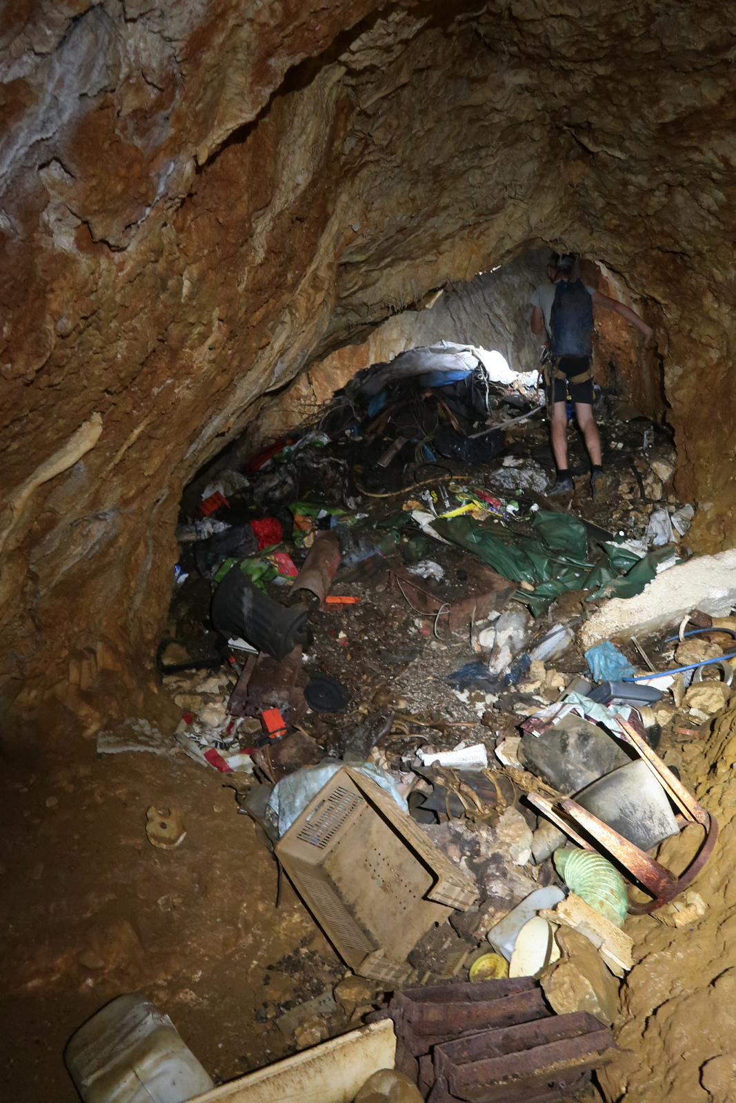Dépôt sauvage de déchets au fond d'un aven d'une profondeur de 15 mètres.
