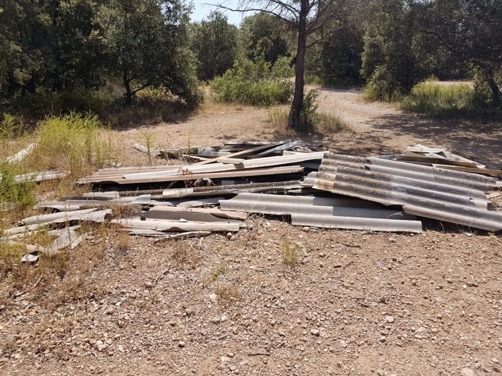 Dépôt sauvage de décombres de chantier avec possible présence d amiante.