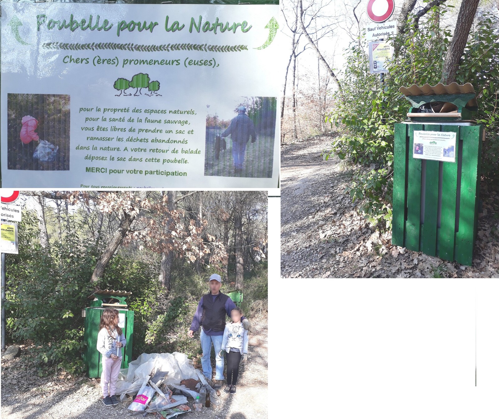 C'est une poubelle (privée, gérée par des bénévoles) installée au début des sentiers de balades dans les espaces boisés de la commune, avec une petite affiche qui incite les promeneurs à prendre un des sacs mis à disposition sur la poubelle pour ramasser les détritus trouvés en cours de balade et jeter le sac dans la poubelle au retour de la promenade.