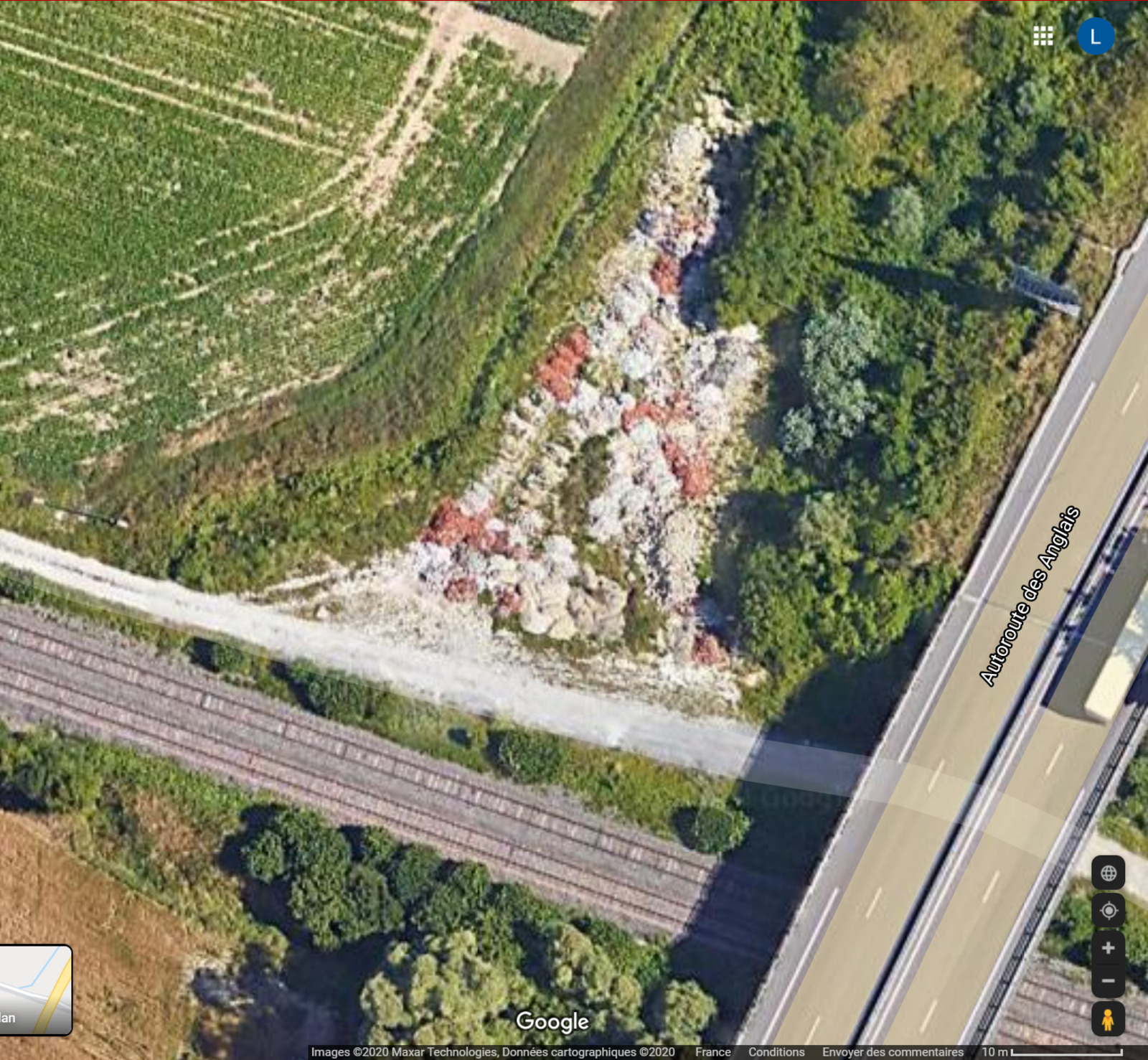 Visiblement cette surface, qui était boisée en 2010 (d'après google Street View) a été défrichée pour laisser place à un dépôt de gravas de construction. Nous interrogeons les services municipaux pour comprendre comment cela a pu arriver.