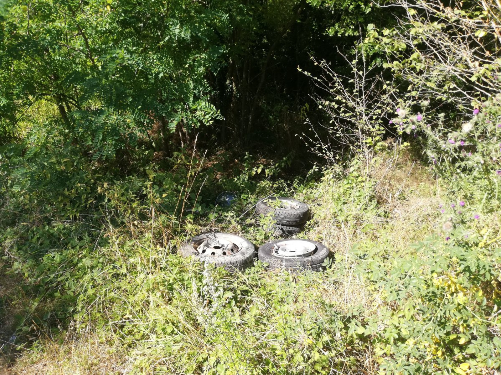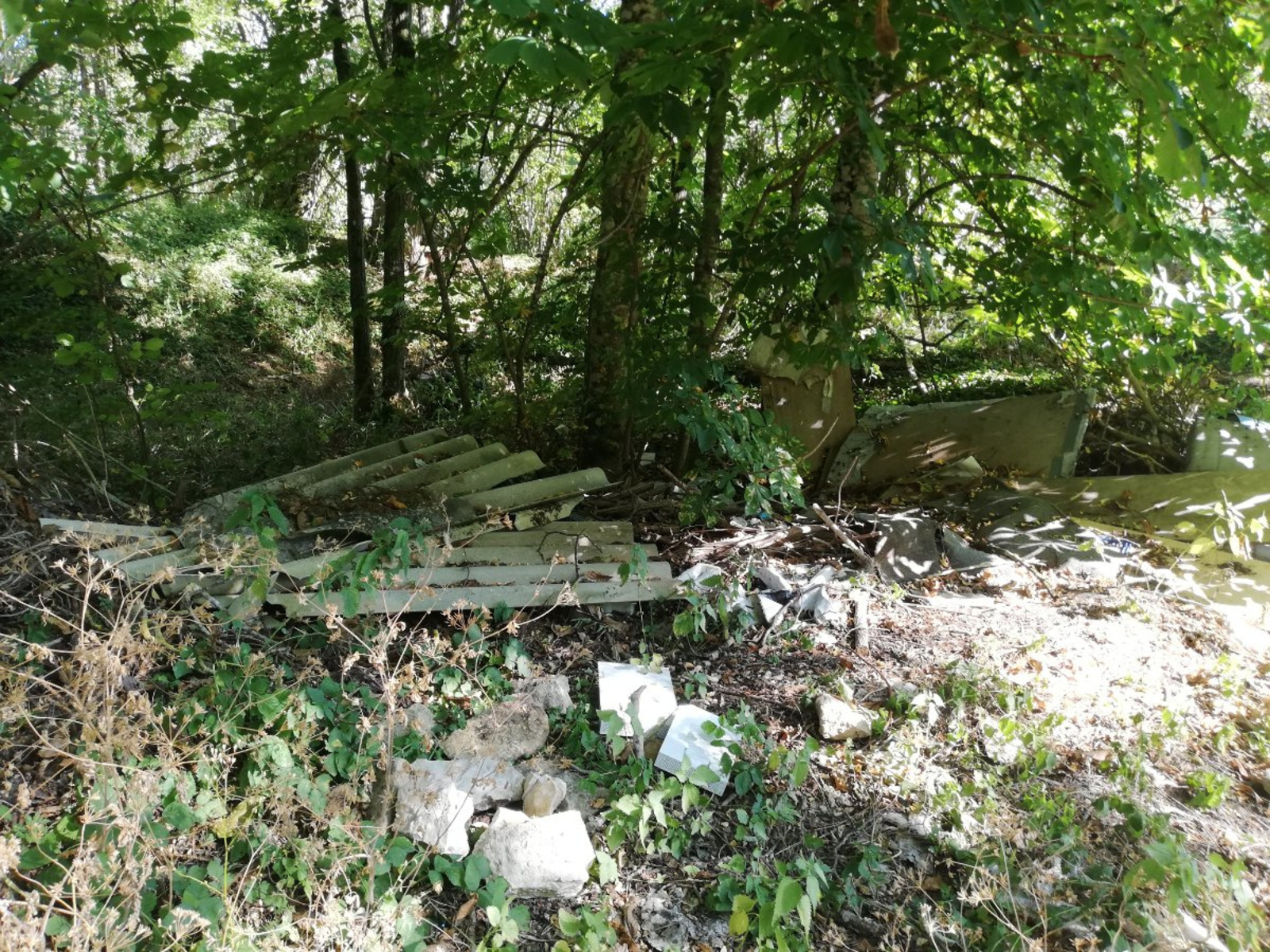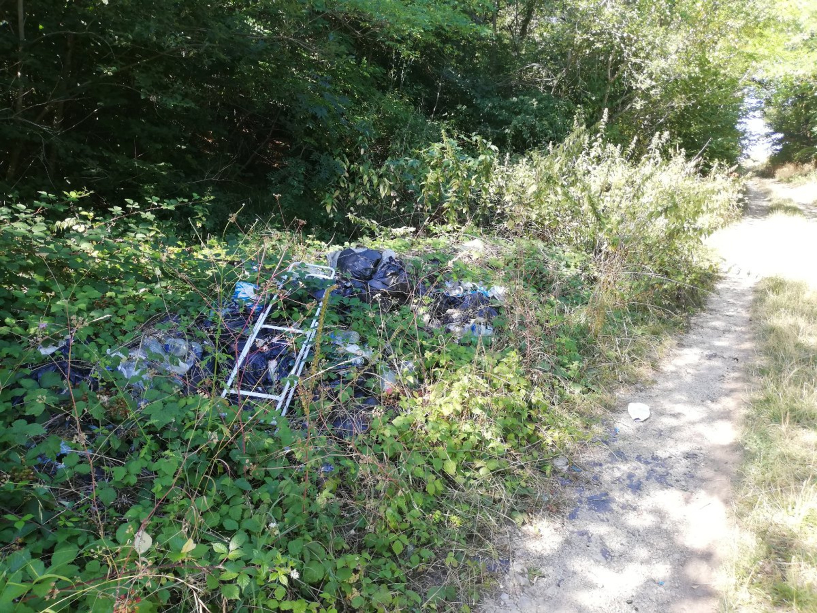 Dans chemin menant à des champs, dépôt de Débris de voiture, toiture et sacs poubelles répartis en divers endroits le long du chemin.