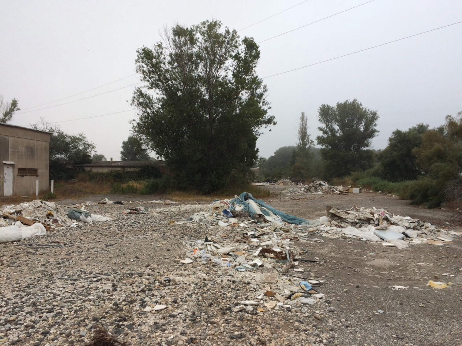 Plusieurs tas de déchets provenant de travaux dans le bâtiment et pneus poids lourd sur le parking d'un ancien restaurant routier de la zone industrielle de Fos-sur-Mer