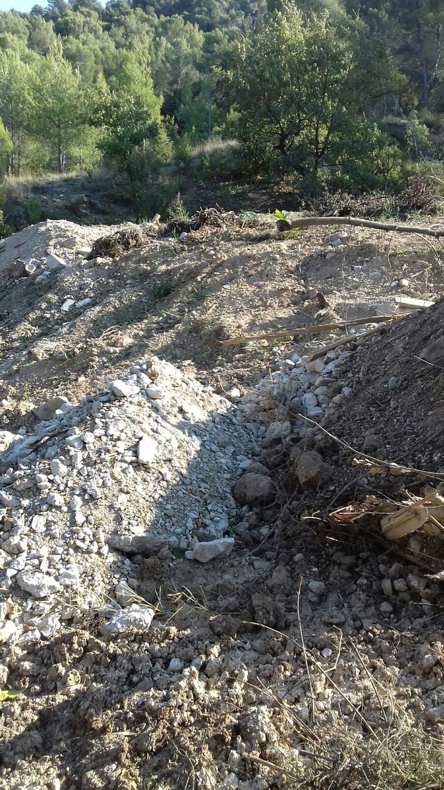 Des camions de chantier déversent gravats et détritus sur un terrain privé.