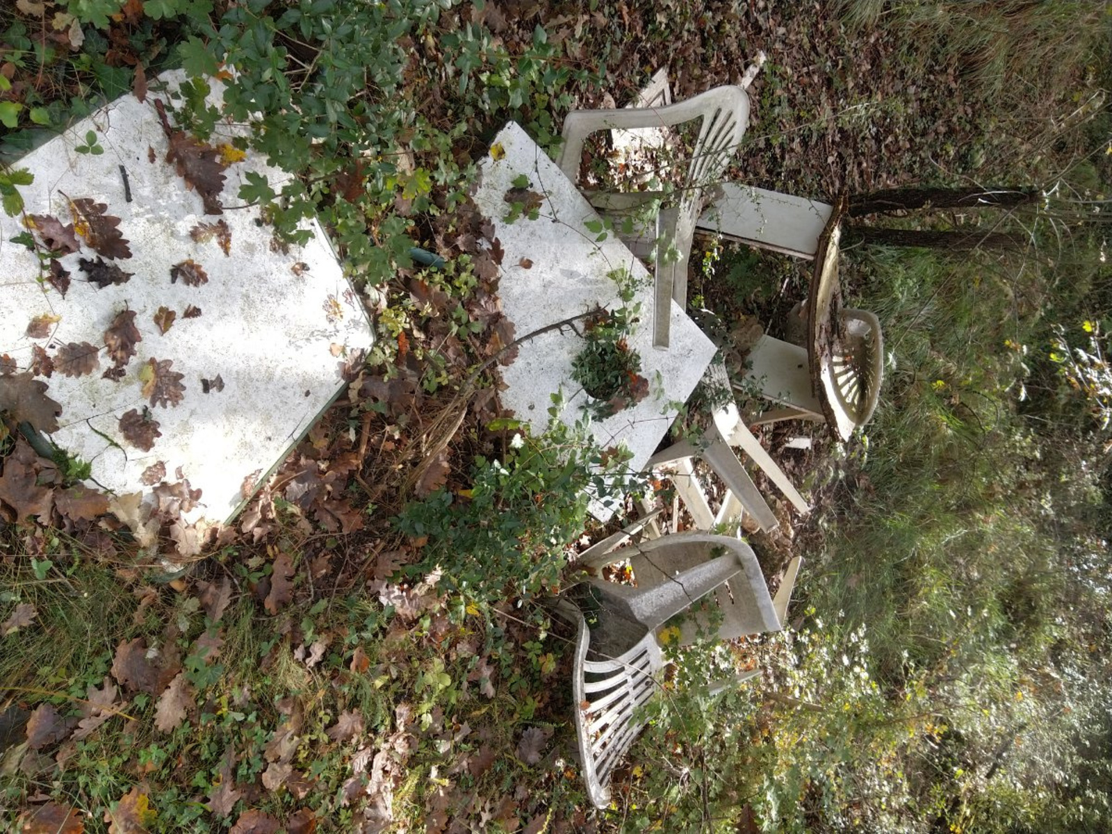 Dépôt sauvage de chaises plastiques, planches...en pleine nature.