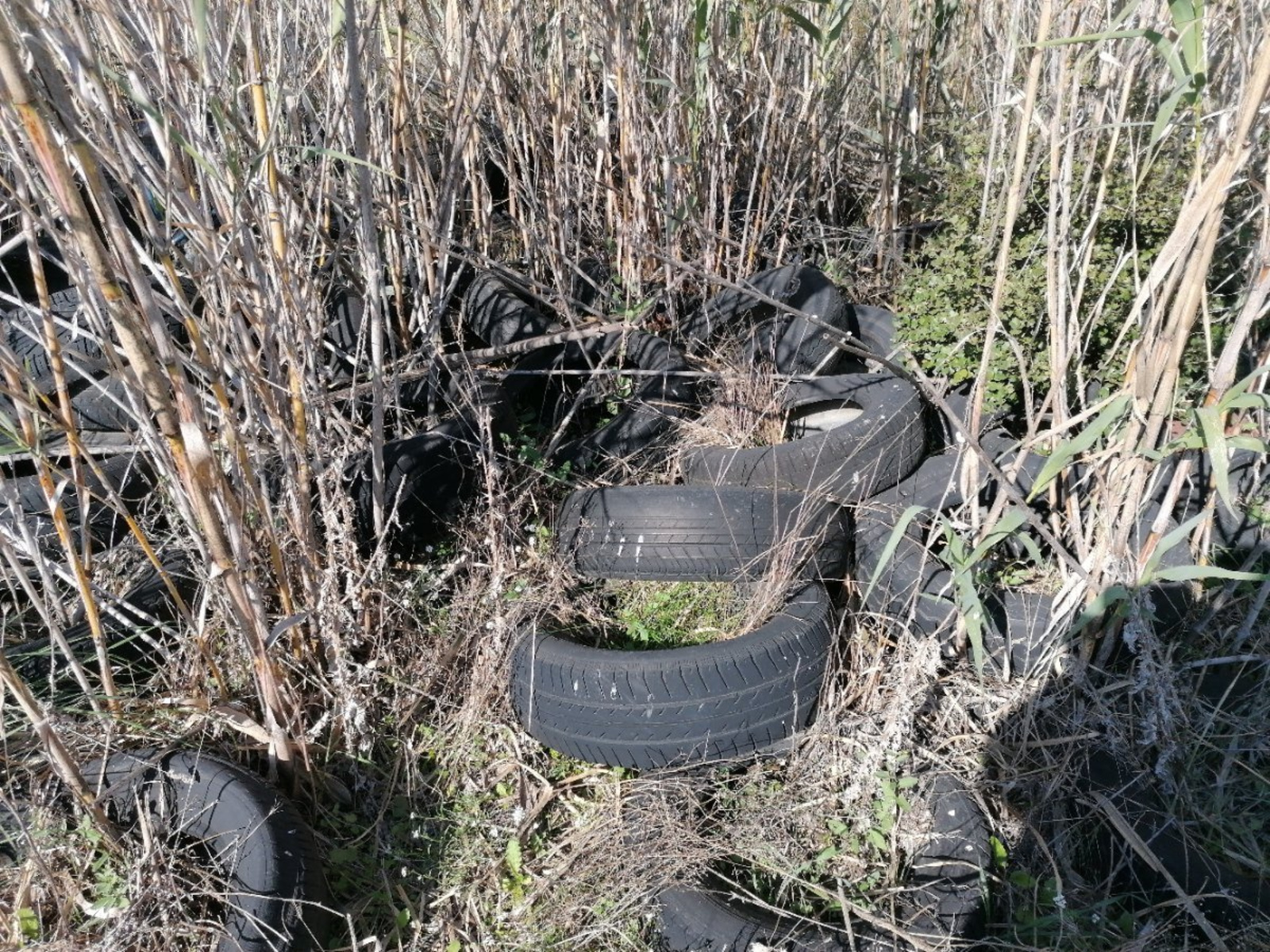 pneus stockés en pleine nature.