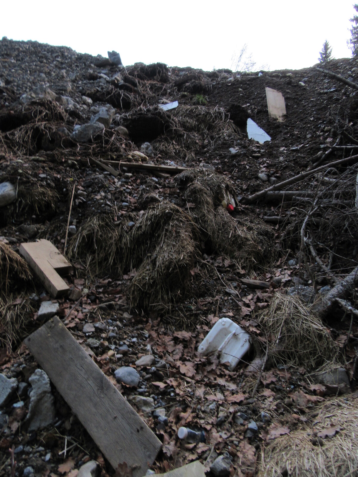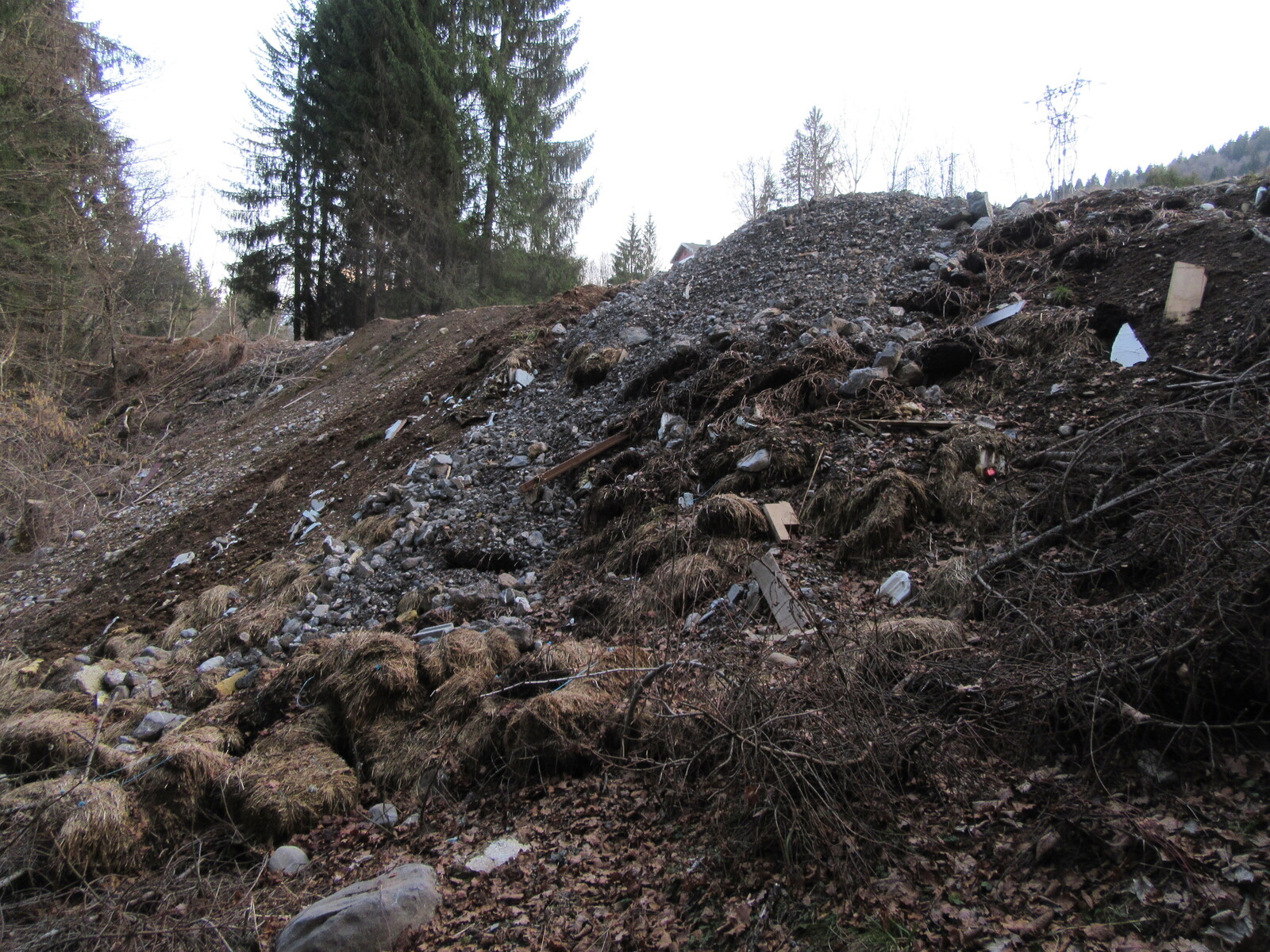 Dépôt sauvage de divers de matériaux (déchets verts, plastiques, cartons, purin...) et remblaiement d'un ravin au-dessus de la Dranse.