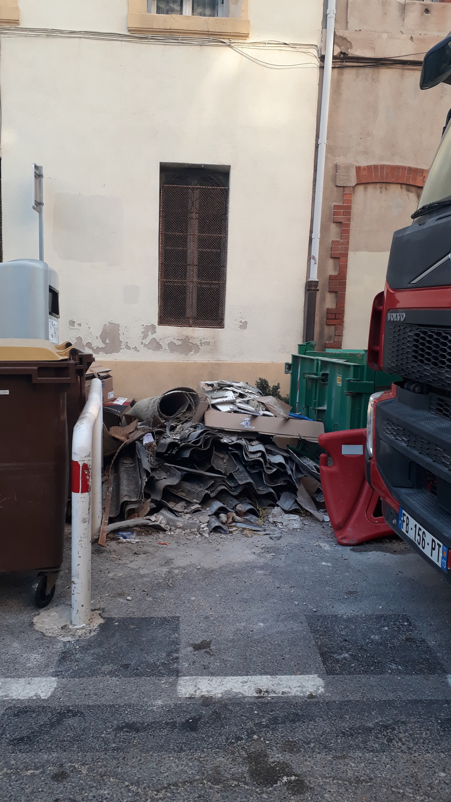 dépôt illégal de plaques de toit amiantées cassées.