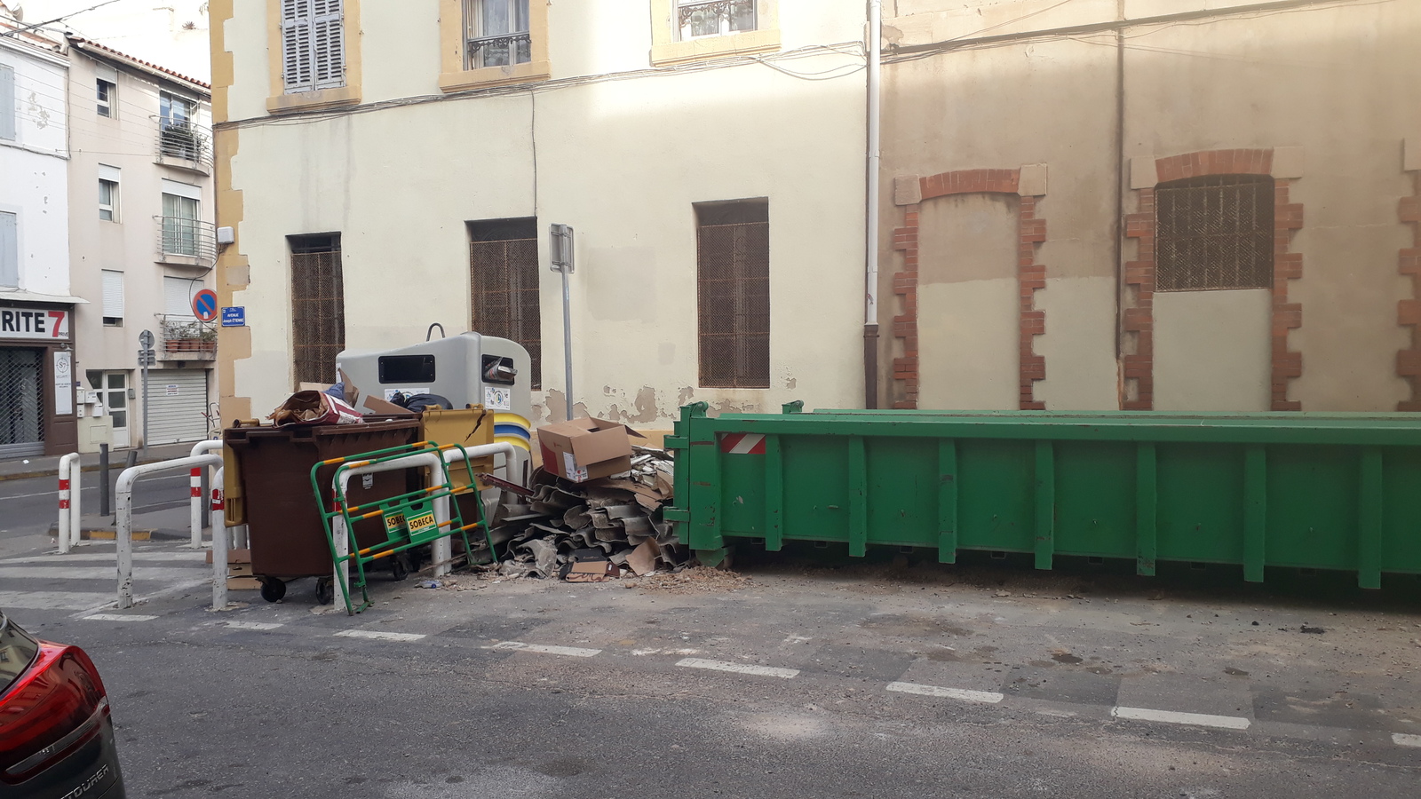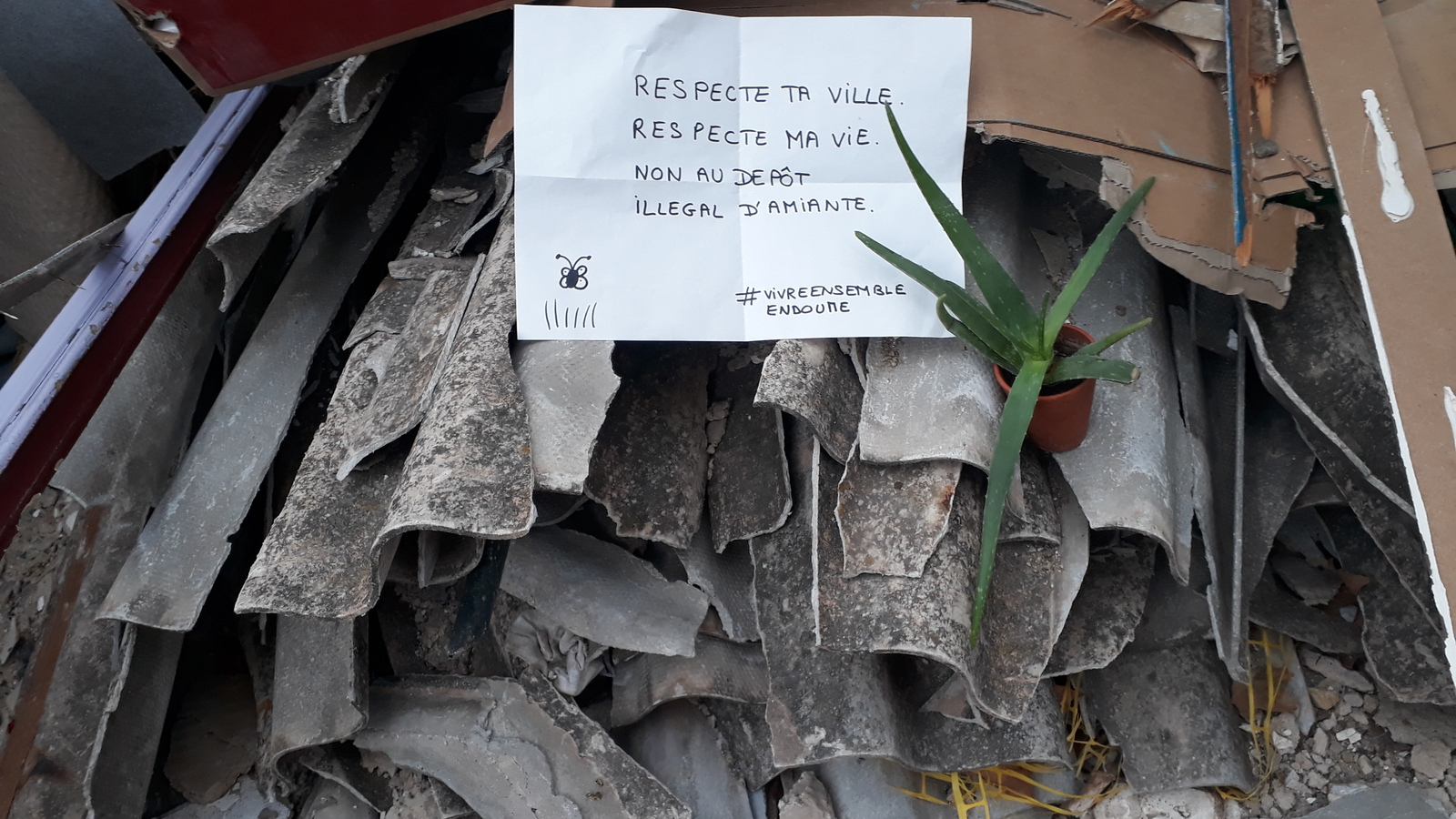 Dépôt sauvage de gravats dont des plaques d'amiante sur l'espace public, sur un lieu de passage de plusieurs dizaines d'écoliers par jour.