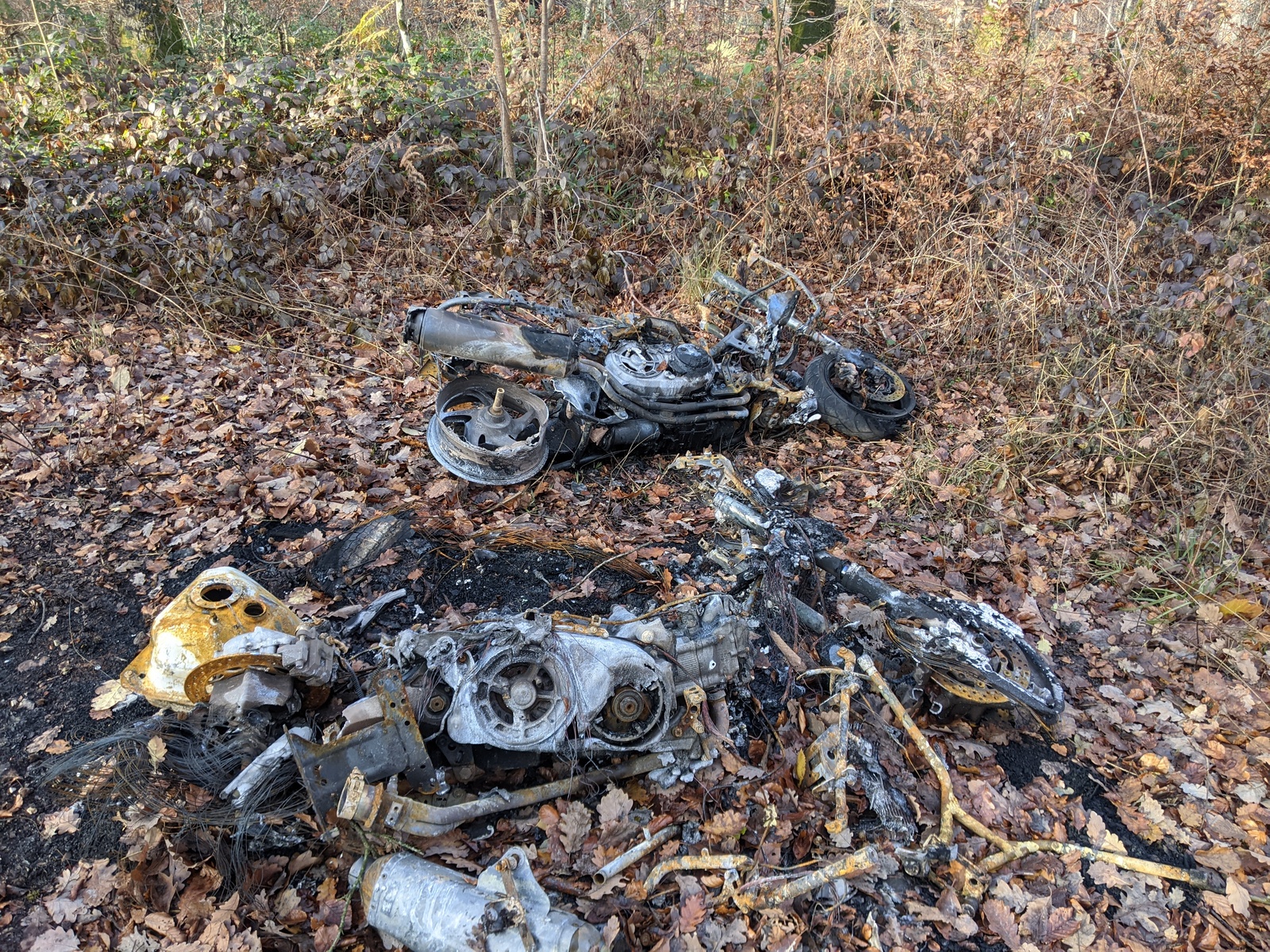 2 motos brûlées abandonnées en sous bois