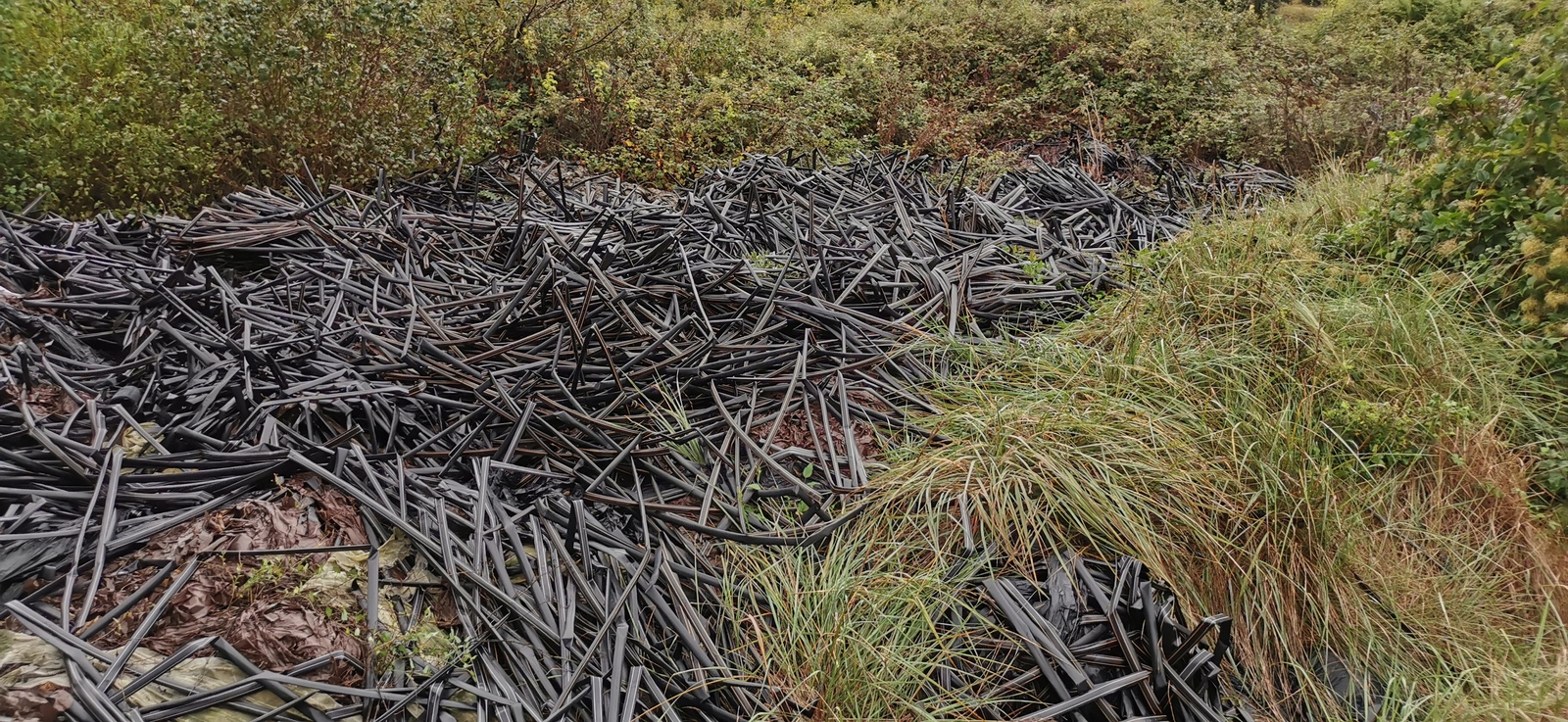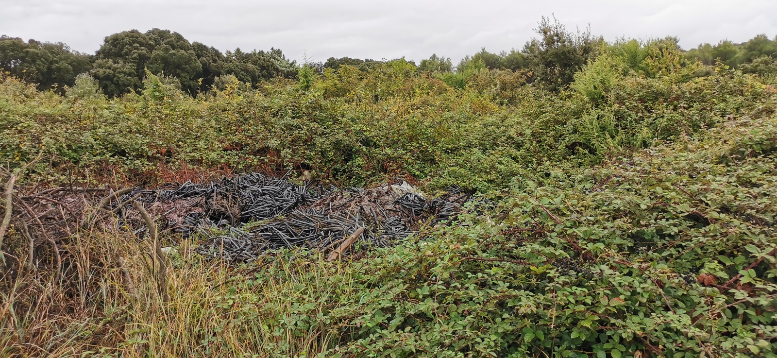 De nombreux tas de tuyaux d'irrigation abandonnés en milieu naturel dans un biotope exceptionnel du parc des Alpilles.