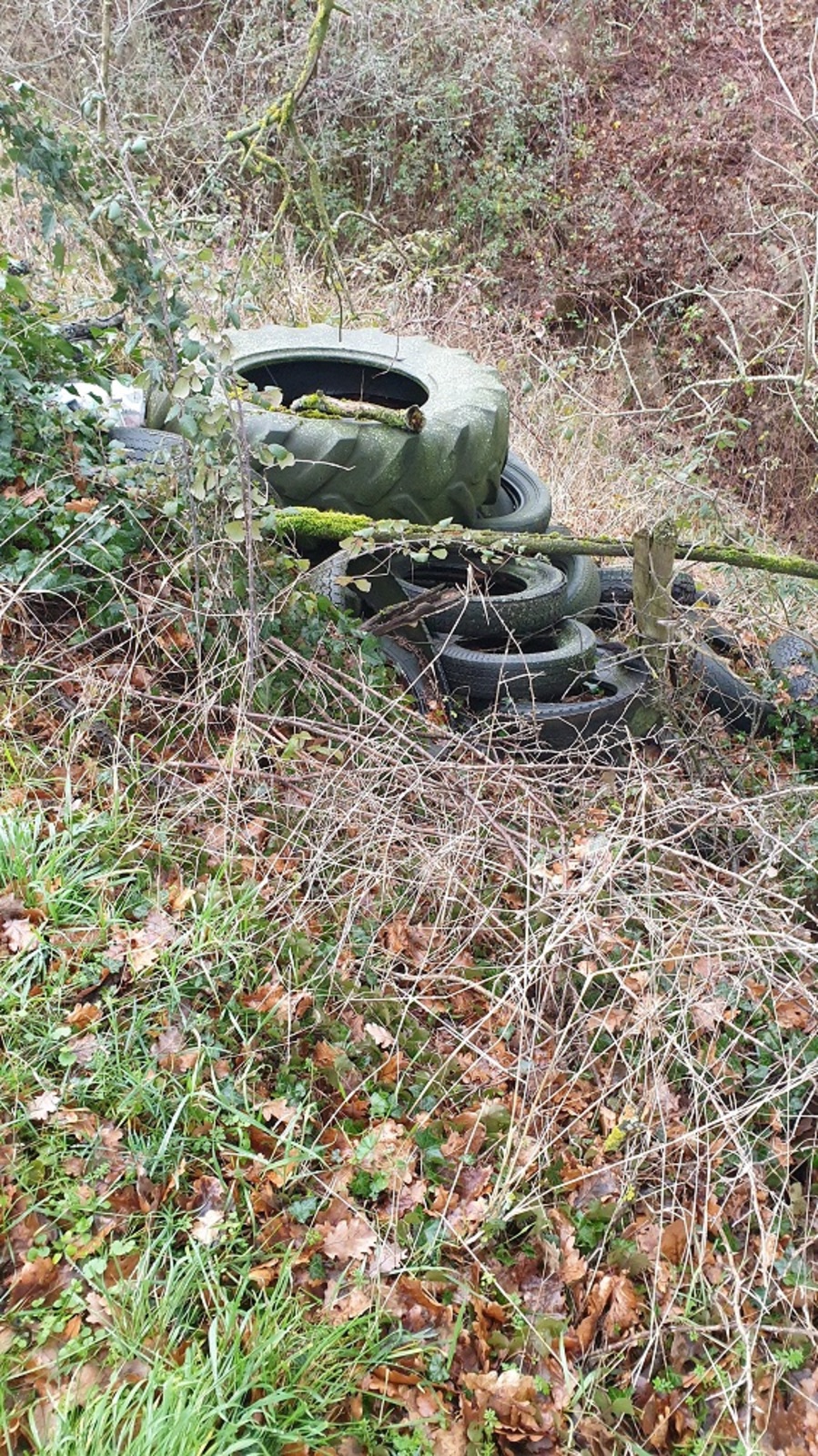 Dépôt de nombreux pneus en bordure d'un chemin surplombant le ruisseau de Ribes.