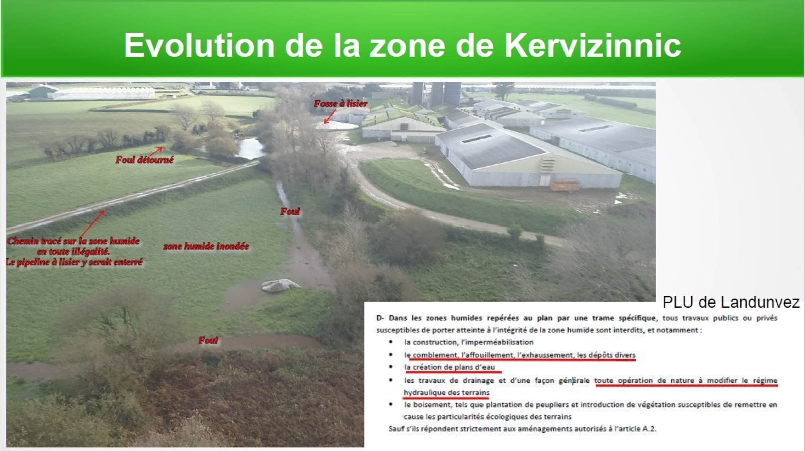 Cet ouvrage semble irrégulier pour de nombreuses raisons. Il constitue un exhaussement en zone humide (interdit dans le PLU de la commune). Il modifie le régime hydraulique de la rivière de Penfoul. Il est en contradiction avec la loi sur l'eau.