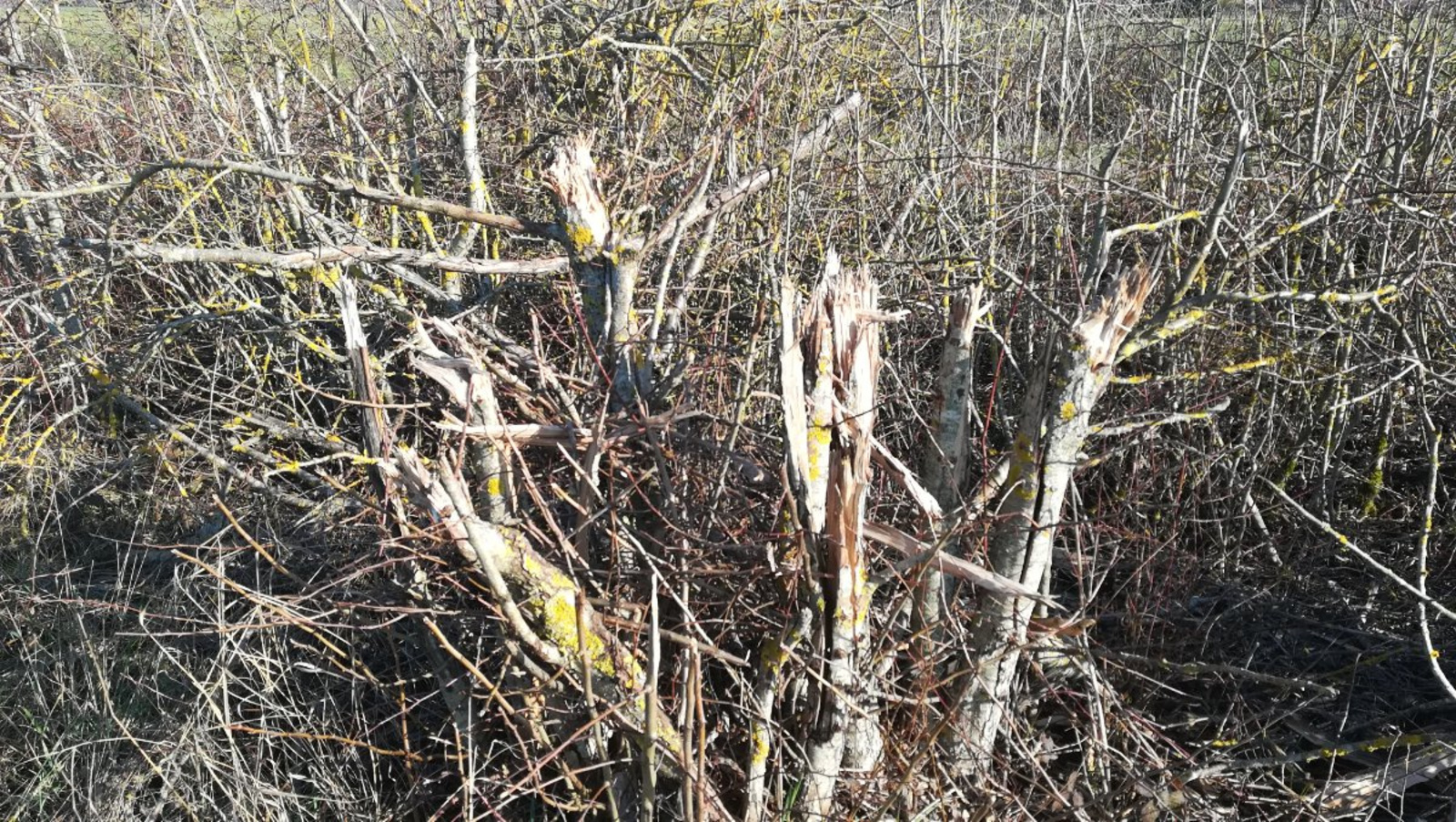 Dégradation dans l'hiver d'une haie d'aubépine le long de l'ancienne ligne de chemin de fer.