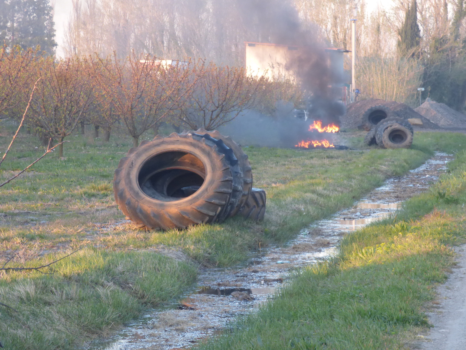 Pour lutter contre les gelées printanières et les dégâts qu’elles peuvent entraîner sur l’arboriculture (abricotiers, cerisiers), certains agriculteurs n’hésitent pas à avoir recours à la combustion de pneus sans se soucier des conséquences sanitaires et environnementales de cette pratique. Celle-ci entraîne notamment une dégradation de la qualité de l'air avec de fortes émissions de particules et gaz toxiques.