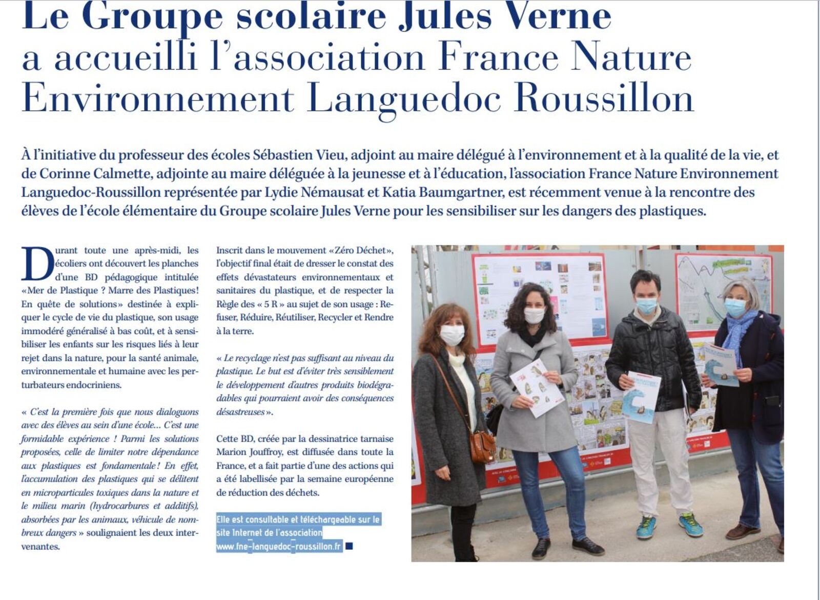 Le 4 mars 2021, FNE LR est allée à la rencontre des écoliers pour remettre à chacun d'eux un exemplaire de sa bande-dessinée "Mer de plastique ? Marre des plastiques !"