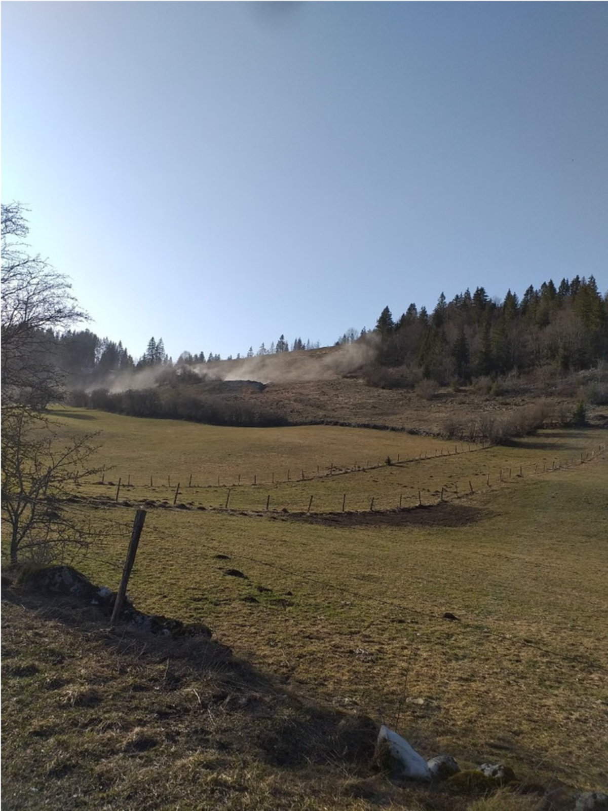 Nuages de poussières provoqués par le va et vient des camions montant à la carrière de Mouthe (société gérée par M. Colombo) qui se dépose sur les champs agricoles avoisinants. L' agriculteur ne peut plus mettre ces vaches au champs par temps sec.
