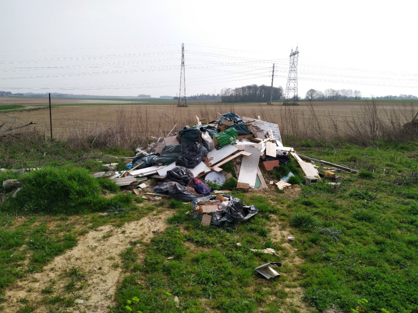 Abandon de déchets sur une plateforme agricole (sac poubelle, bois, plastique, tôle, etc.)