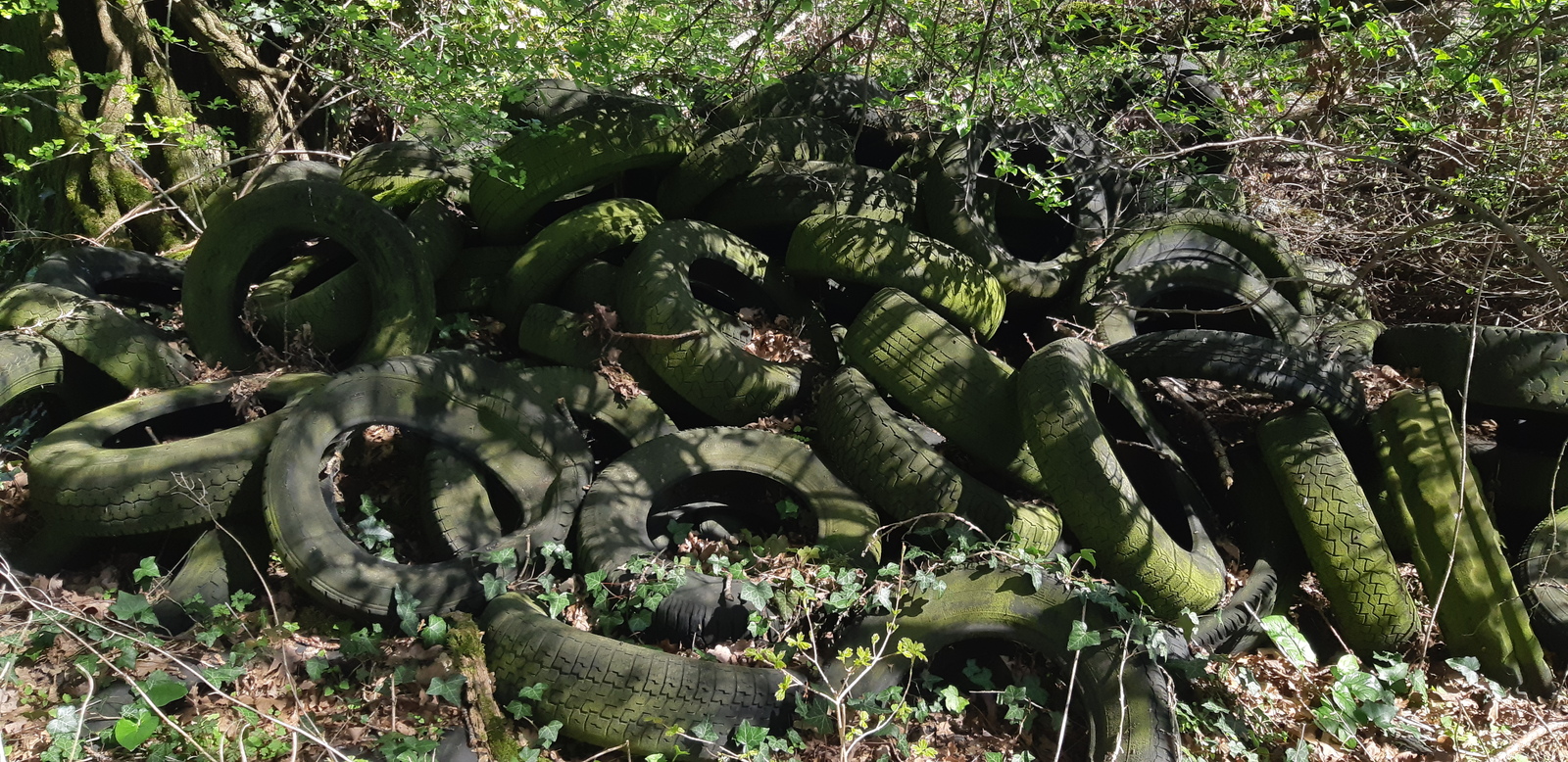 dépôt de pneus assez ancien en lisière boisement / champs