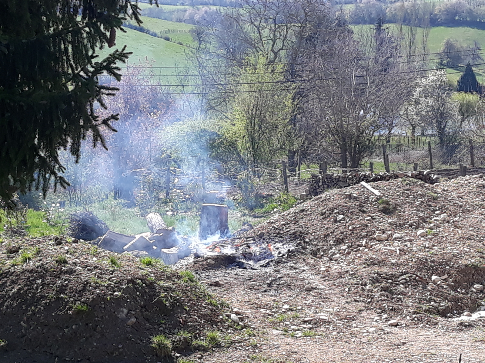 Brûlage de déchets de chantier (palettes, emballages carton, plastiques, polystyrènes,...) sur un site de construction de maison individuelle.