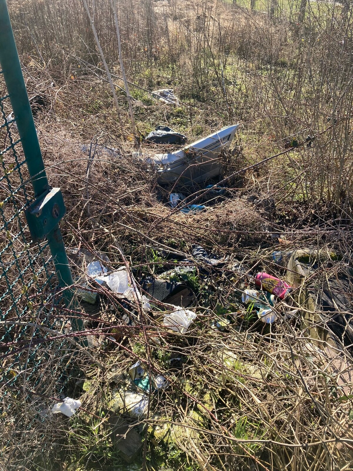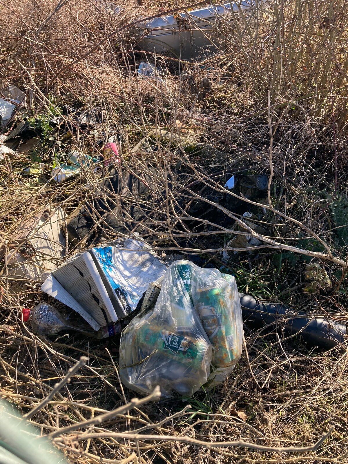 par choc de voiture, des sac en plastique, bouteille en plastique, bombe de peinture, planche de bois et autres déchets.