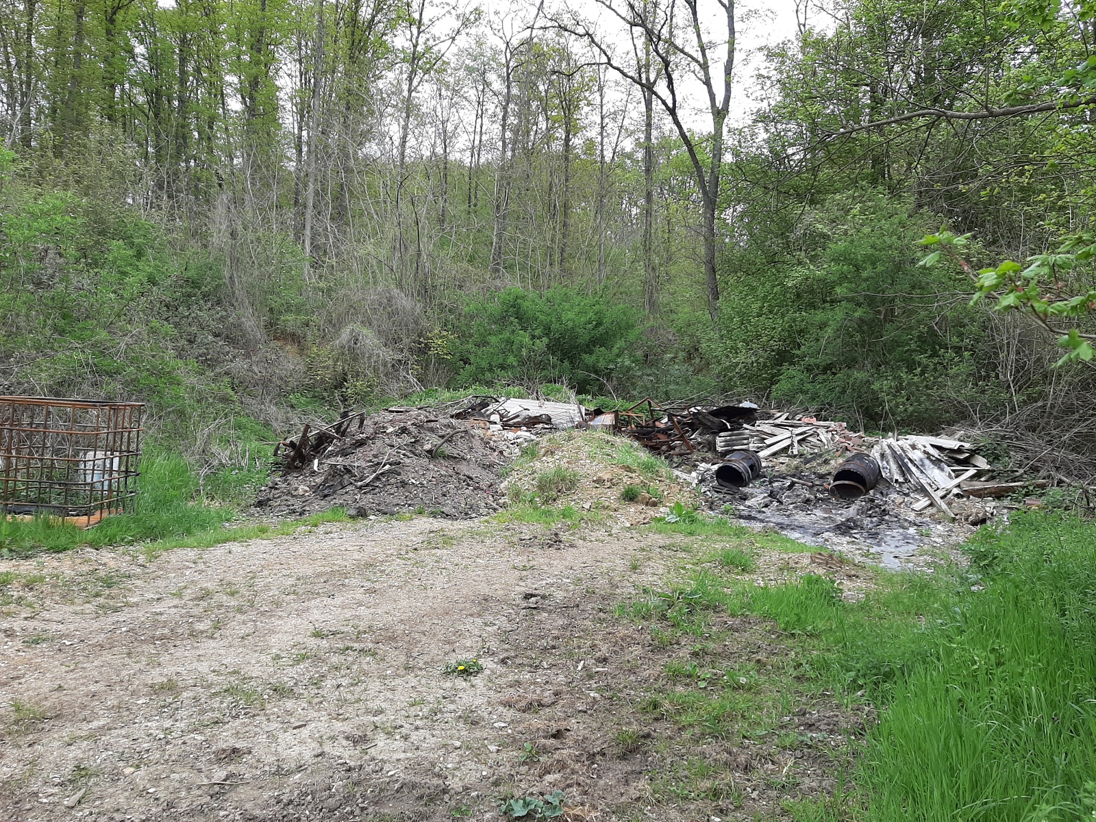 Décharge sauvage contenant des produits chimiques (2 bidons visibles), des plaques de fibrociment et divers matériaux (bois, plastique, métal) en partie brulés.