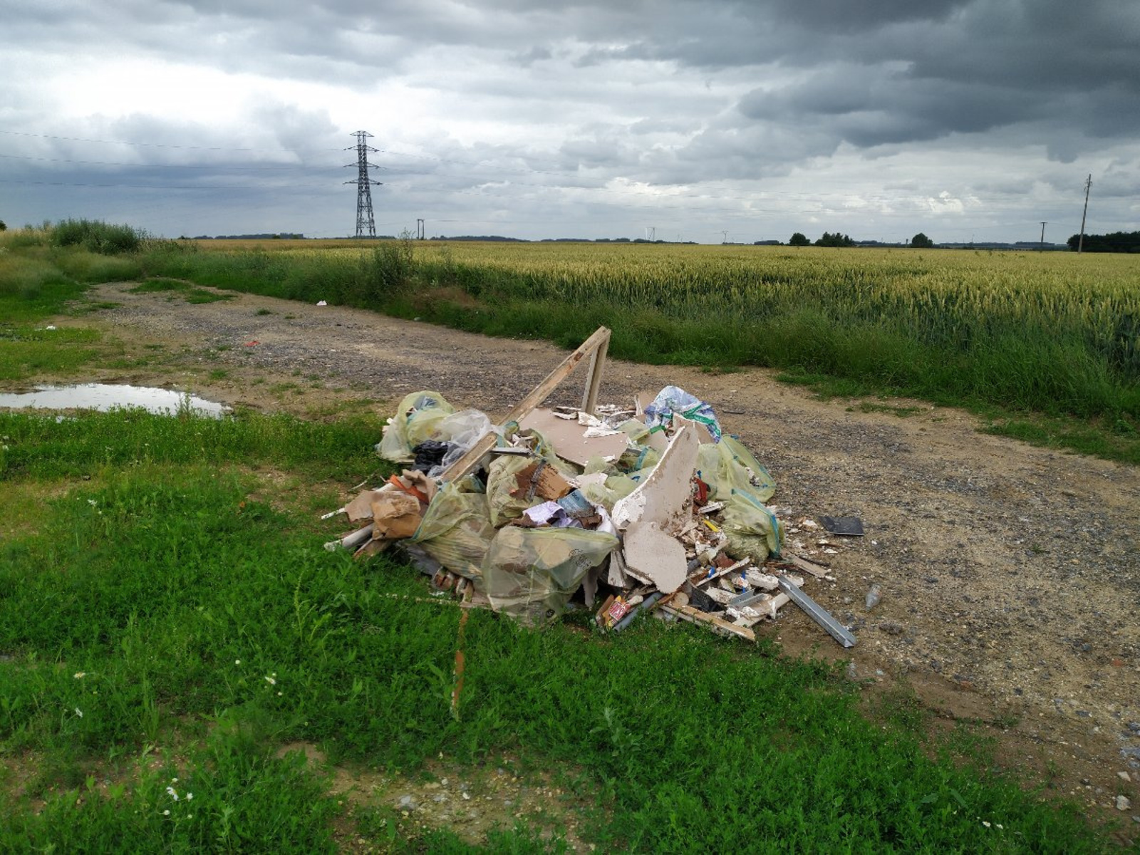 Dépôt de reste de chantier : plastiques, tôles, cartons, sacs poubelles de détritus