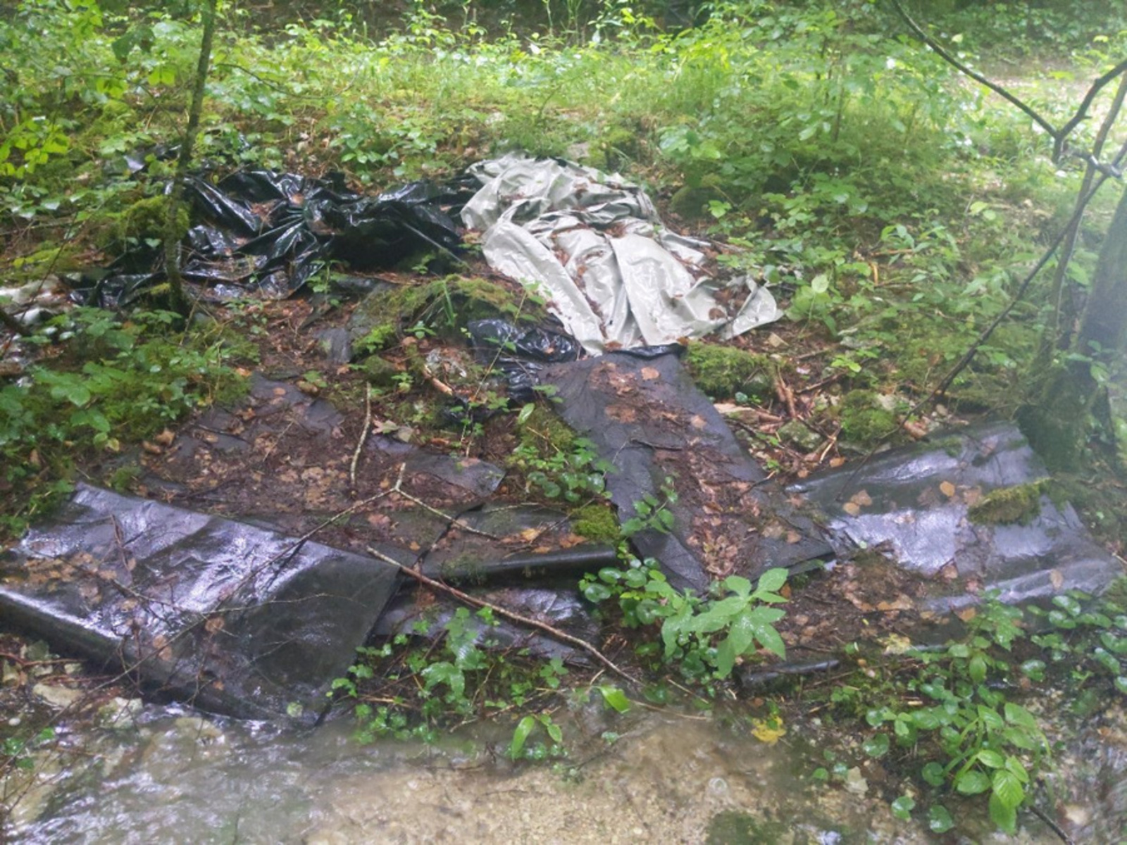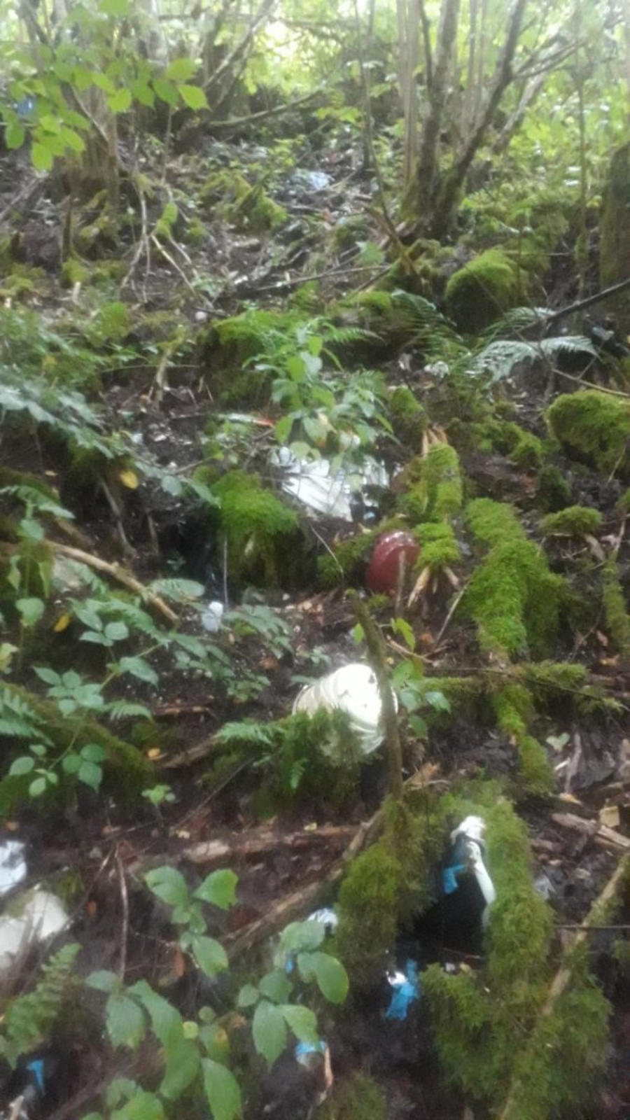 Dépôt sauvage d'ordures diverses (textile, construction, materiel) sur une vaste zone environ 150 m2
