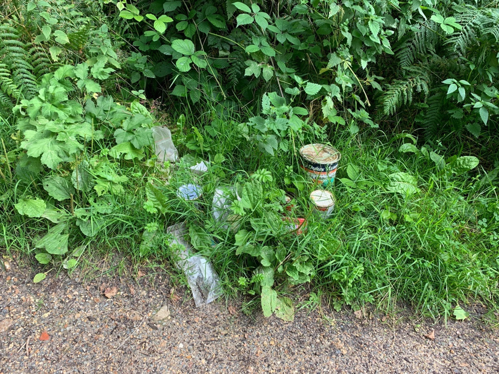 Des déchets tels que des pots de peinture ont été illégalement déposés dans une zone forestière.