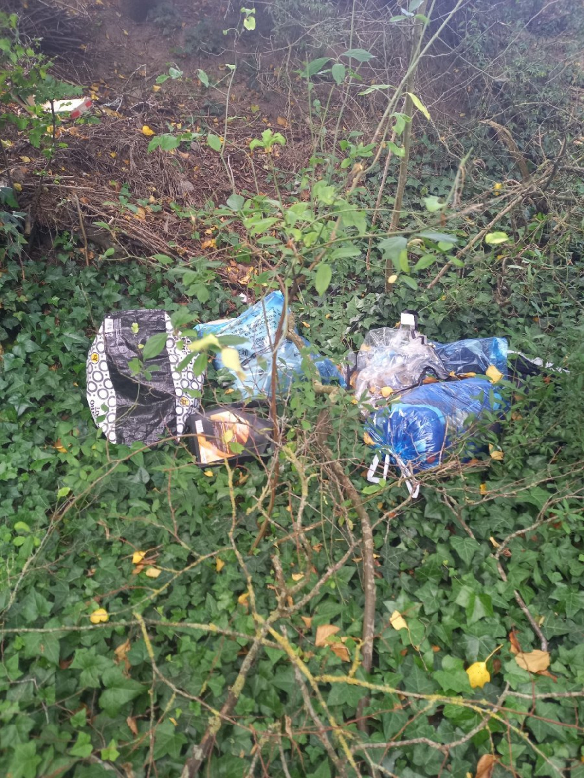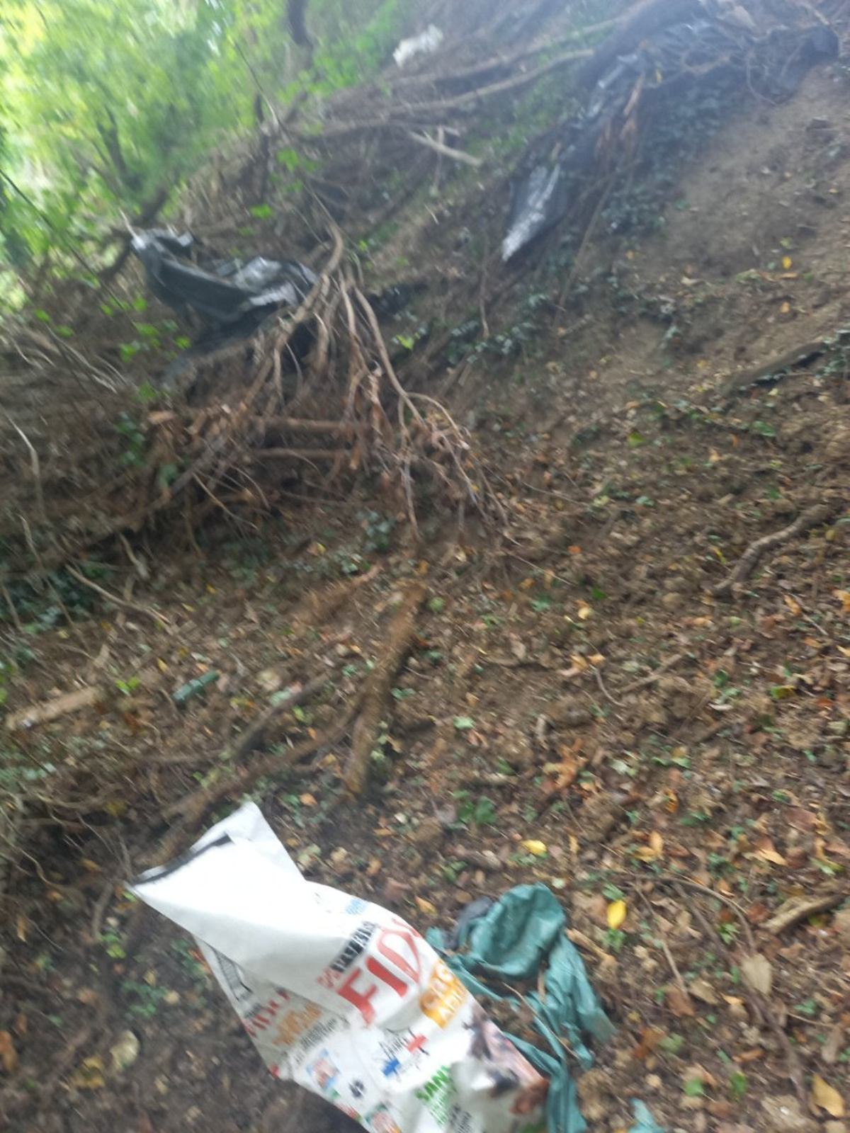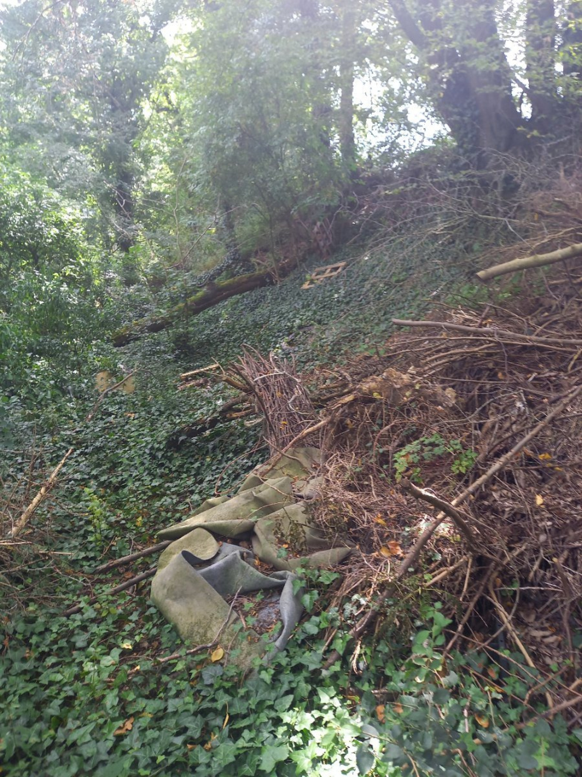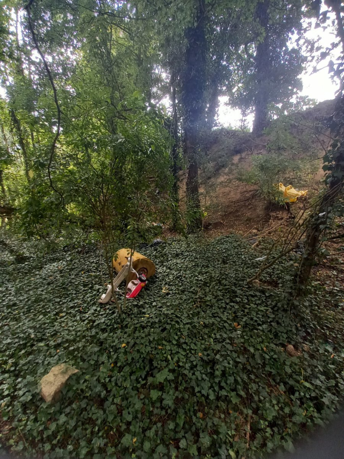 Déchets dispersés sur un bonne quarantaine de mètres et pour certains recouverts par des déchets verts (sacs poubelles, pneus, chauffe eau, jeux d'enfant en plastique, fauteuil, moquette etc...)