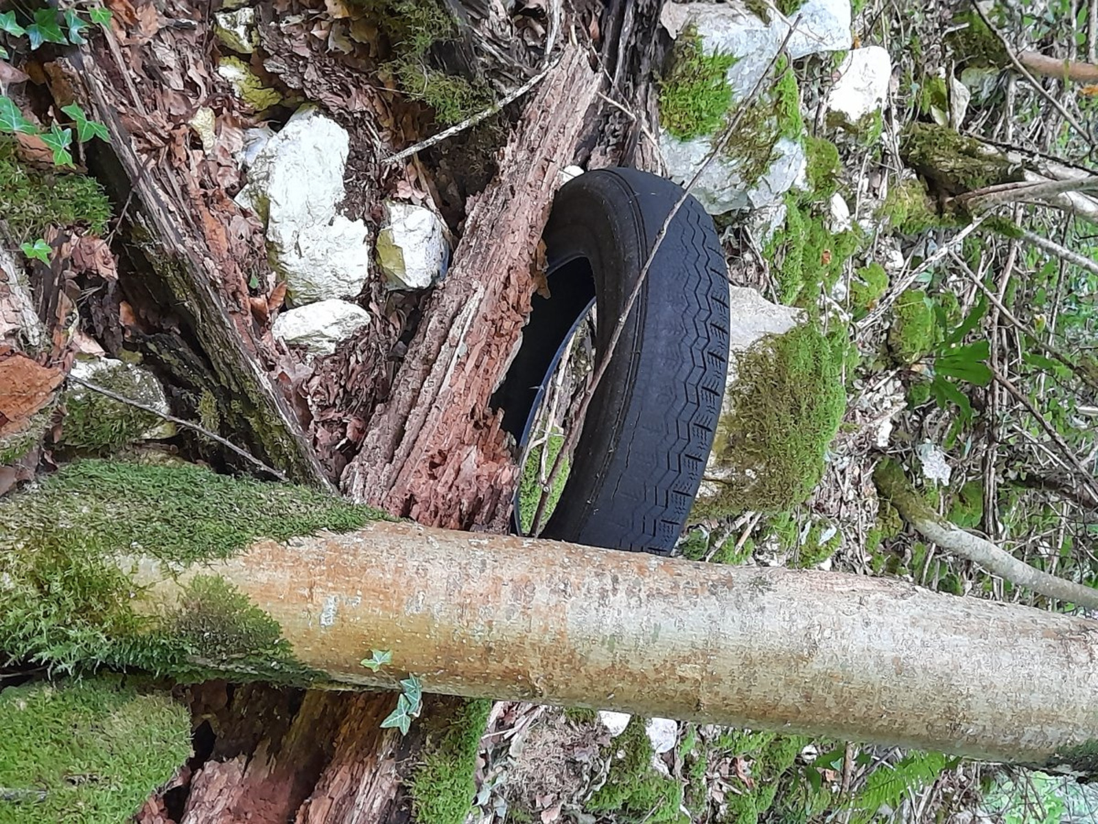 Déchets jetés dans le ravin (carcasses de voiture, pneus).