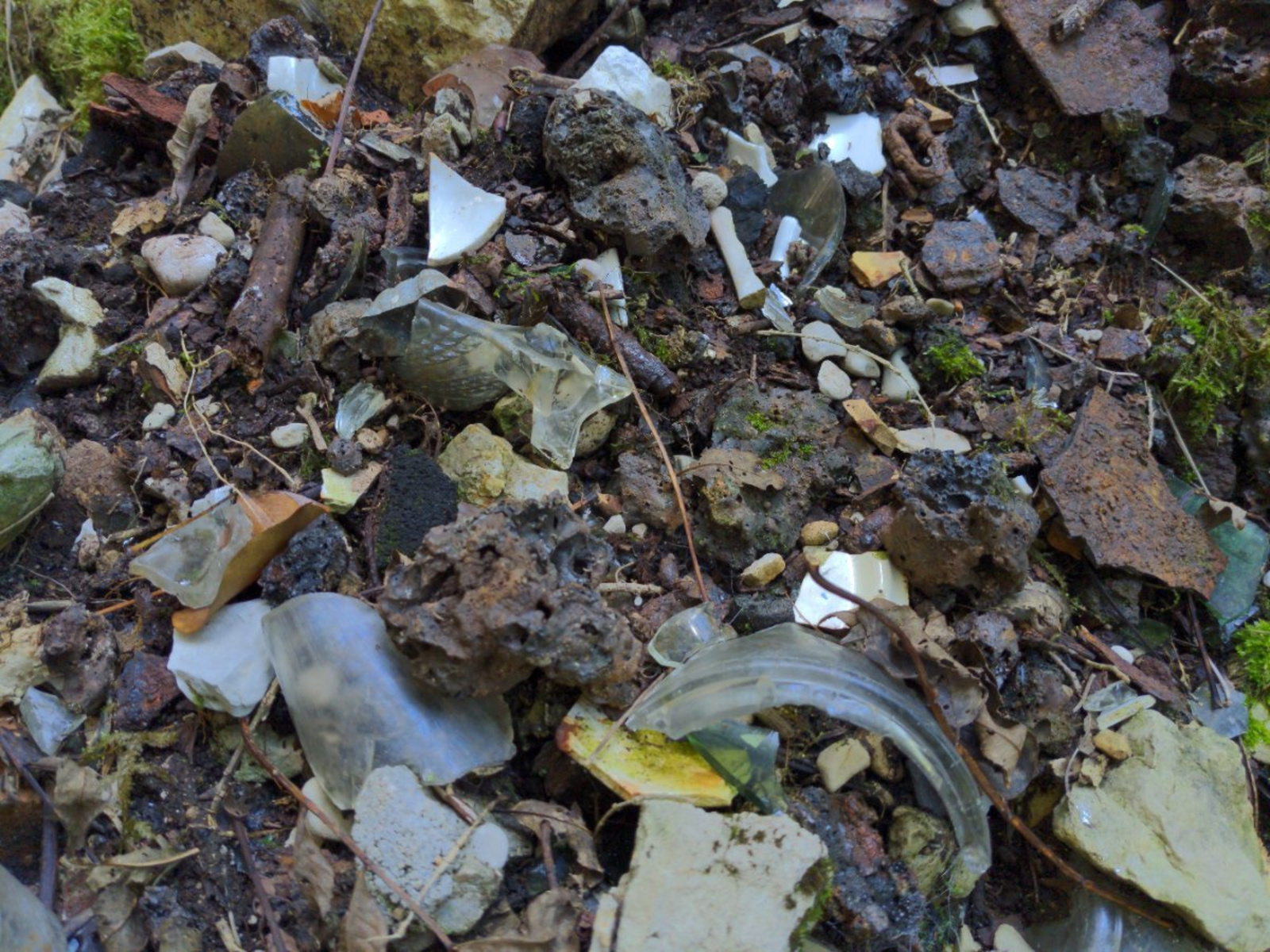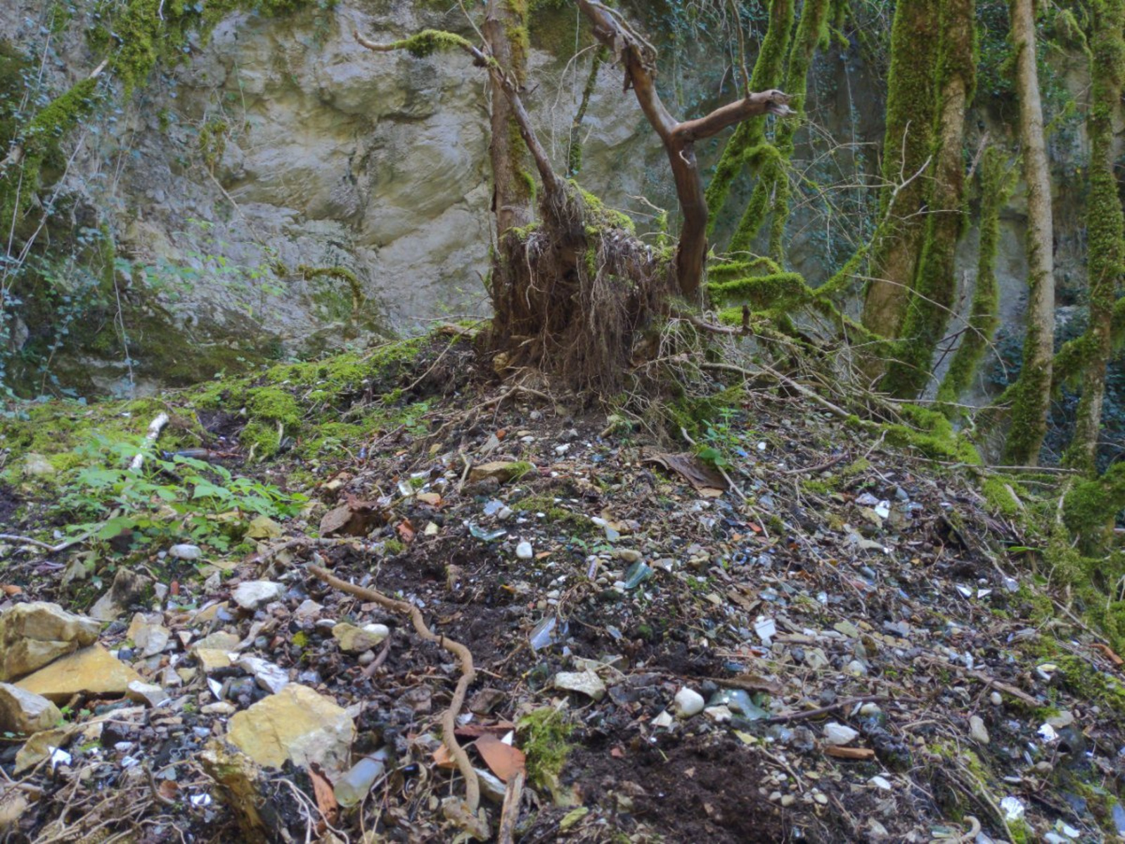 Décharge en pied de falaise dans les gorges de la Bienne : verres cassés, ferrailles, taules, résidus de fonderies.
