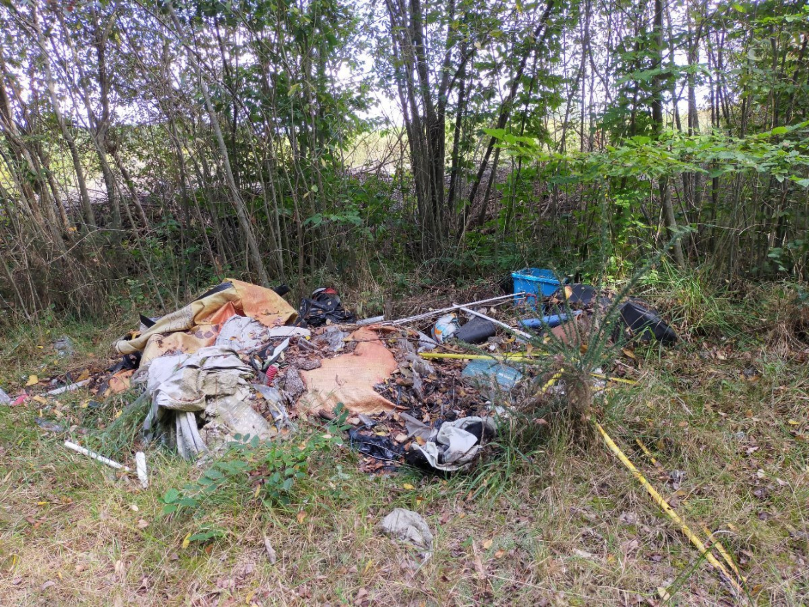 Des déchets divers (bâches en plastique, seaux en plastique, morceaux de bois, déchets verts, sacs poubelle dont on ne connait pas le contenant) ont été entreposés à la lisière d'une forêt.