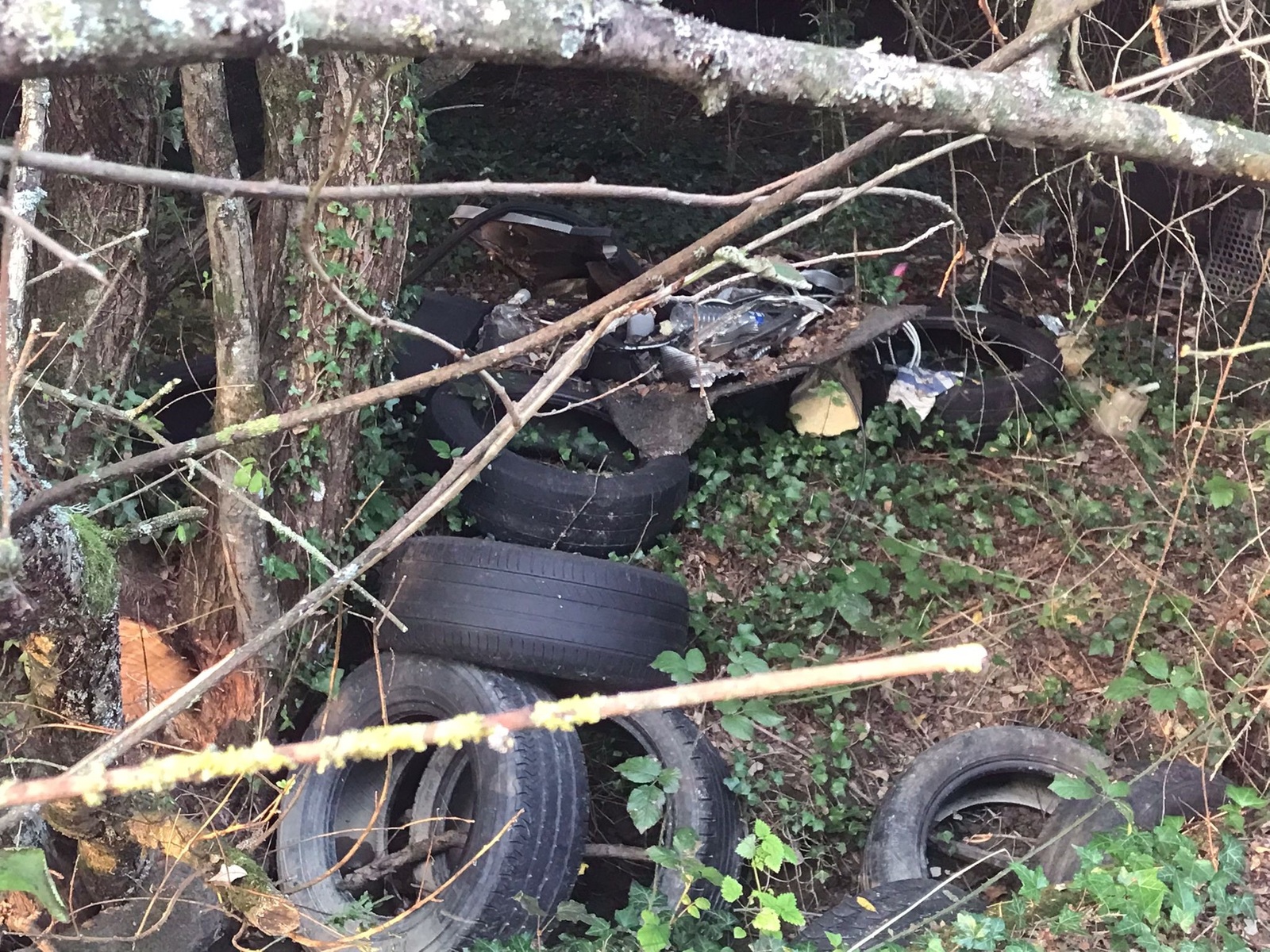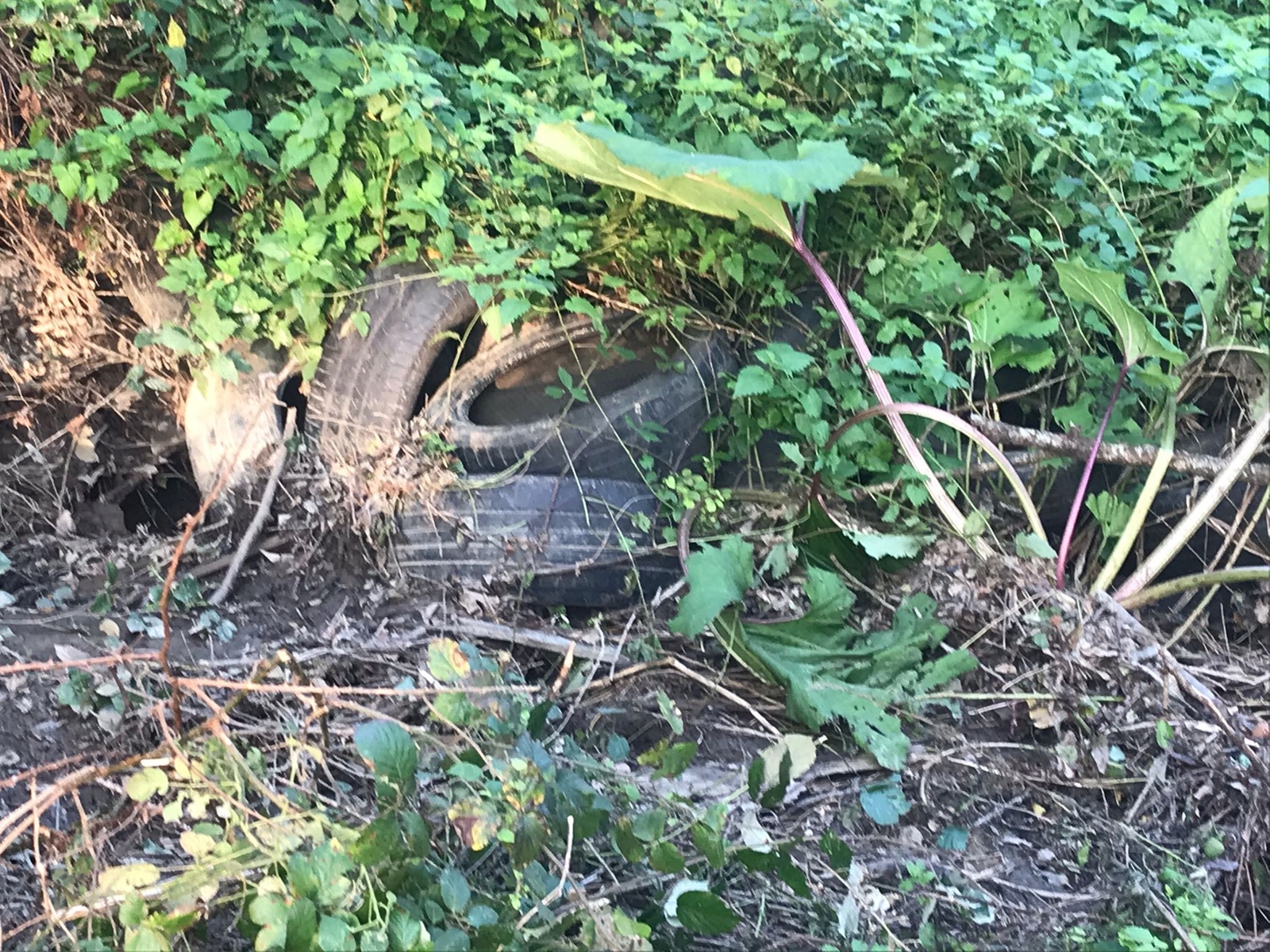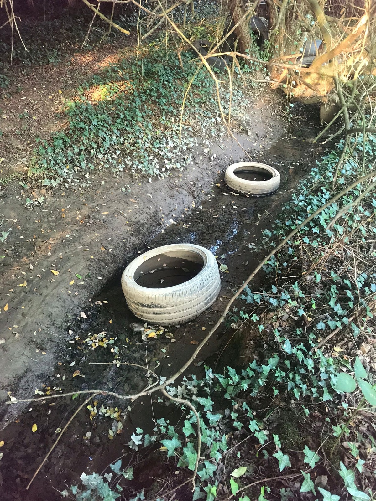 Différents déchets abandonnés à proximité d'un cours d'eau (voire dans le cours d'eau concernant les pneus.