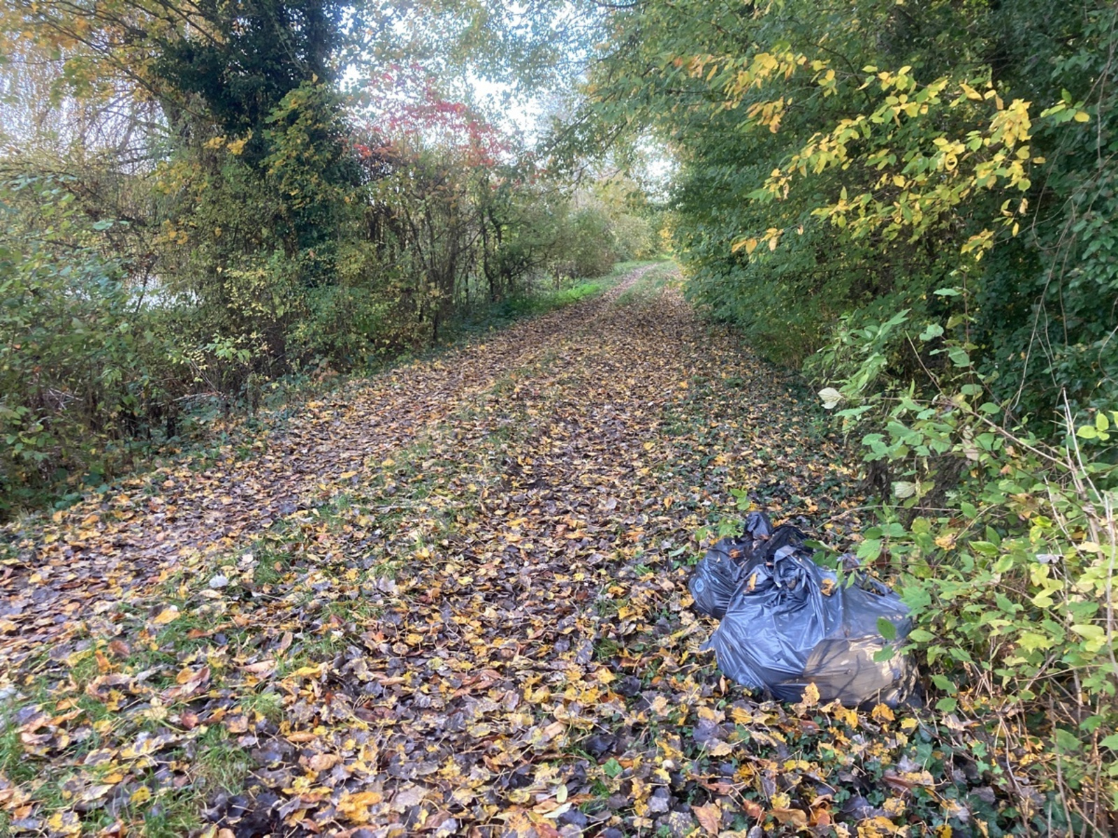 Deux sacs poubelle remplis de bouteilles en verre abandonnés sur un petit chemin le long de l'étang derrière le parc du château d'Arcelot.