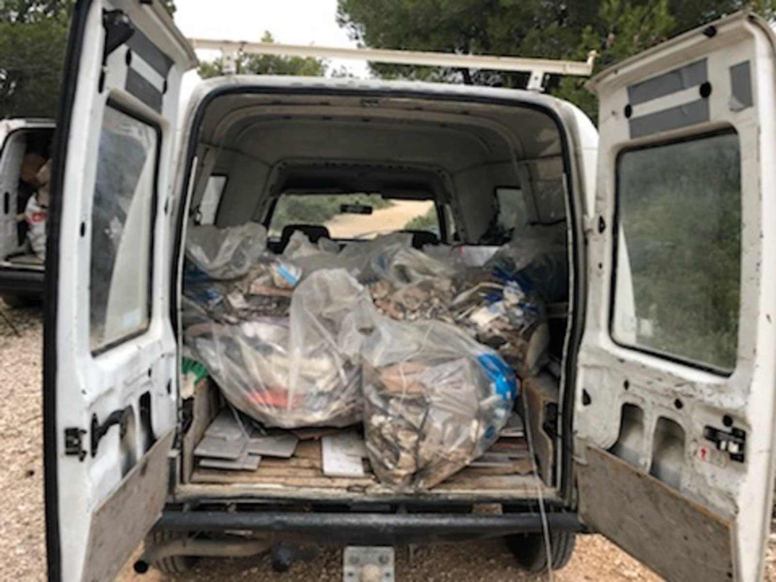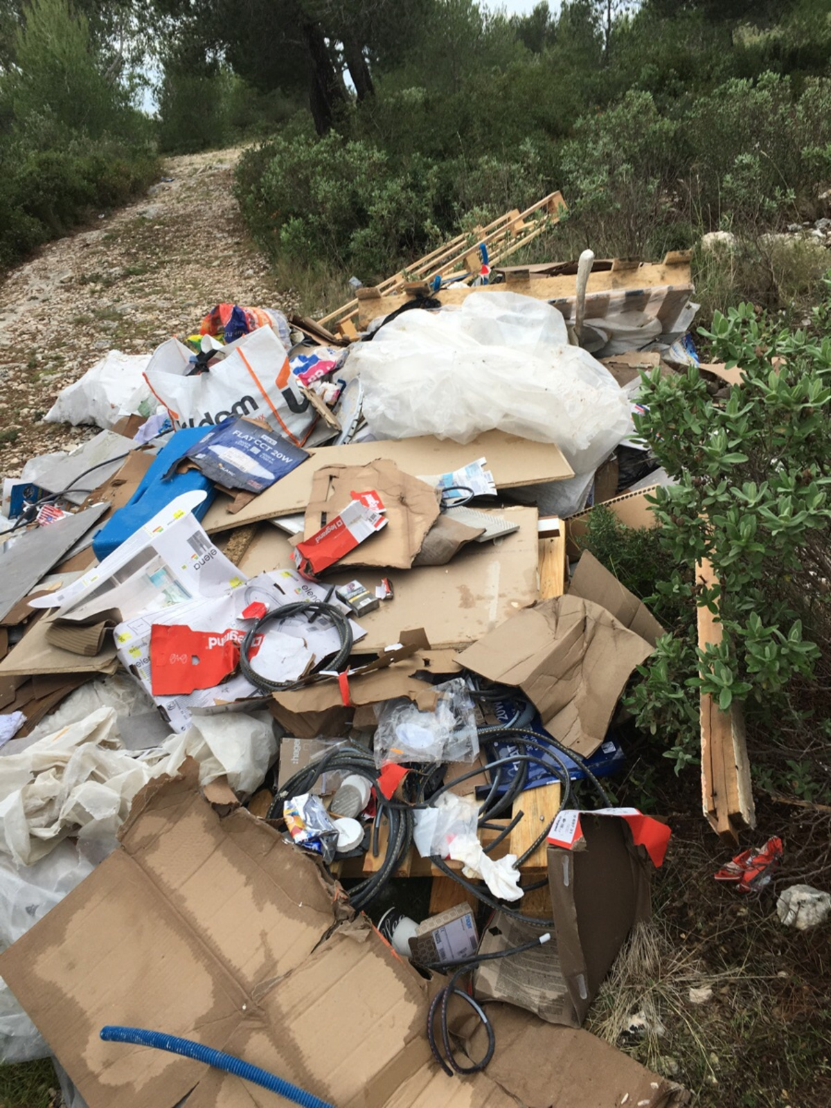 Dépôt sauvage de déchets divers issus du BTP (câbles électriques, cartons, plastiques, palettes...) au bord d'un chemin de randonnée dans le Massif de l'Etoile.