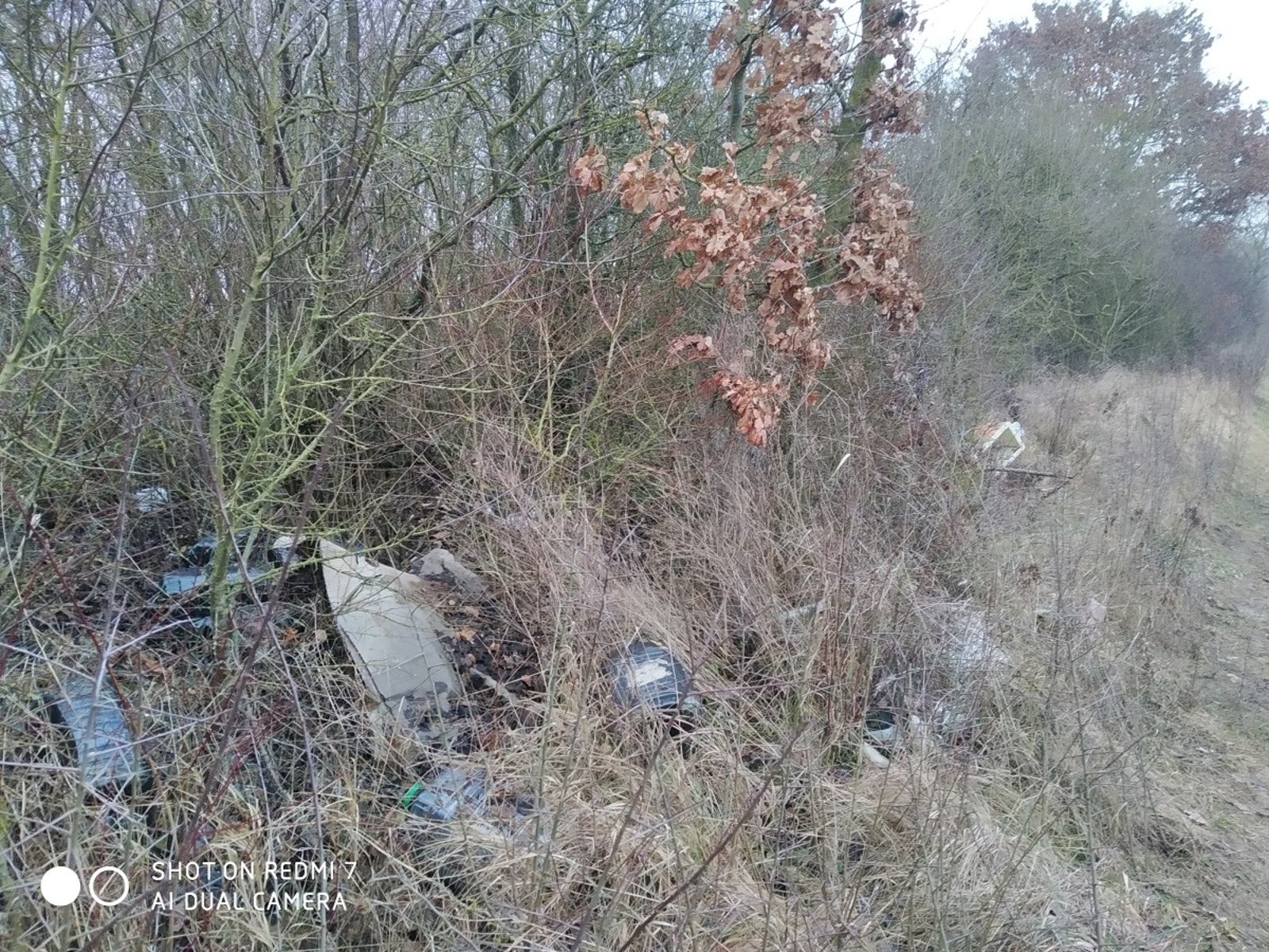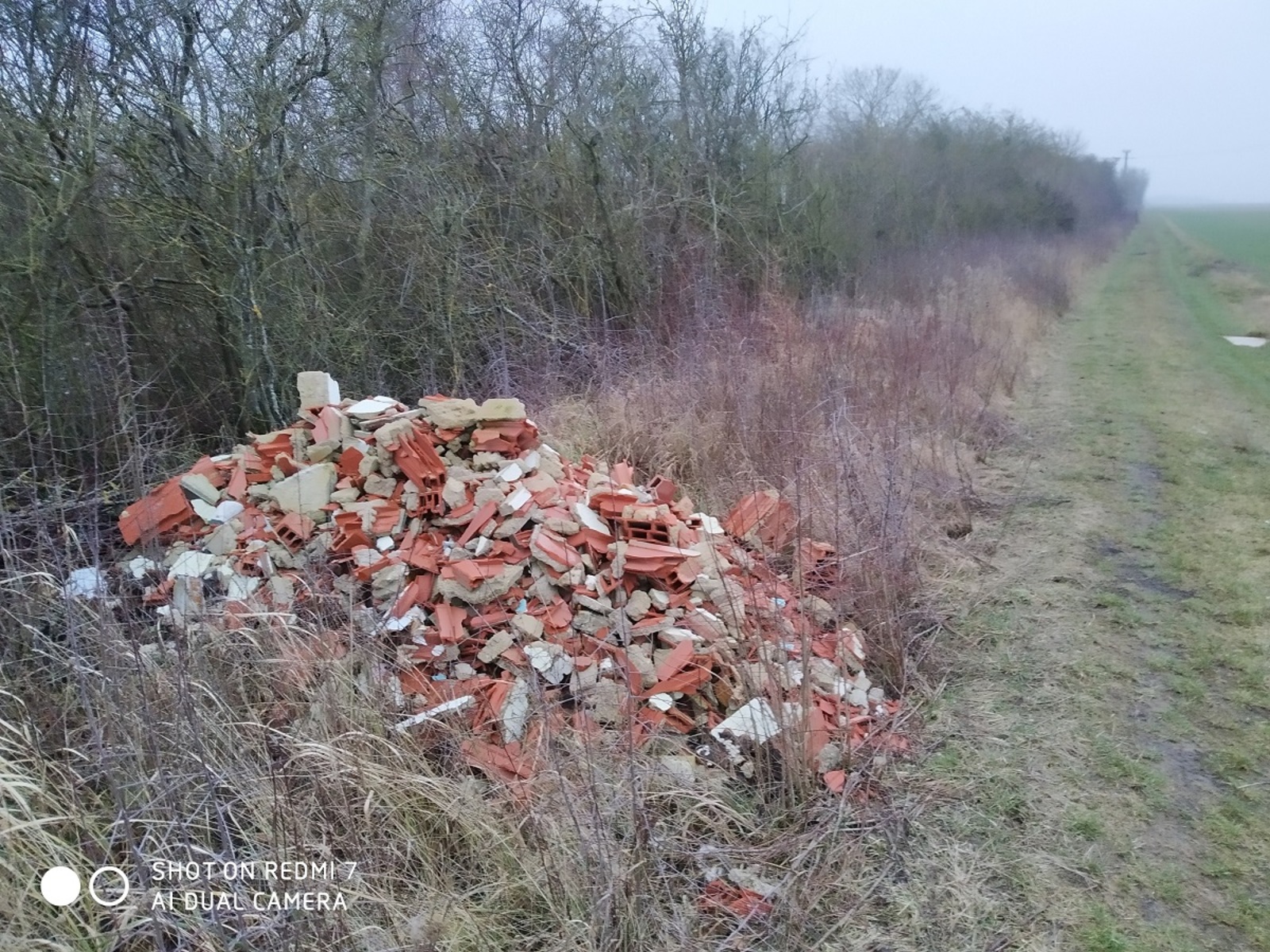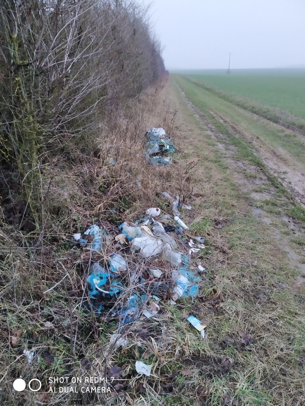 Dépôts de déchets sauvages (verres, plastiques, gravats, ...) sur plus de 500m de longueur le long de l'ancienne voie ferrée propriété du département de l'Aisne et trame verte dans un paysage de grandes cultures.