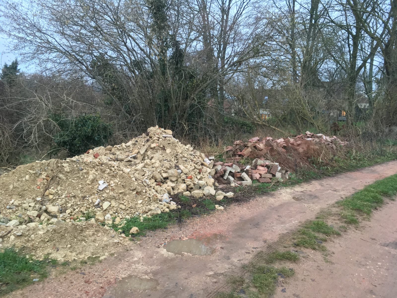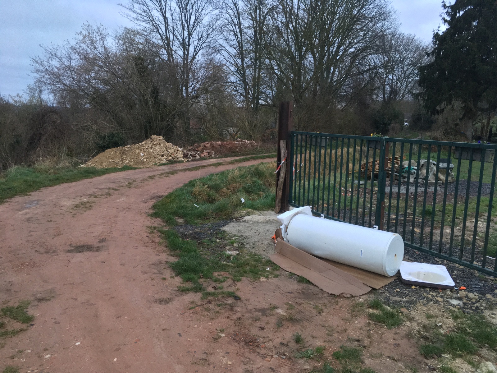 Gravaux, matériaux de construction et vieux ballon d'eau chaude déposés par un habitant, a priori le propriétaire/exploitant du potager derrière le grillage devant lequel gît le ballon. Photos prises le 10/1/2022 d'une situation exitante depuis au moins l'automne passé en ce qui concerne la pile de briques; le ballon doit être là depuis 2 mois (au départ son emballage était intact).