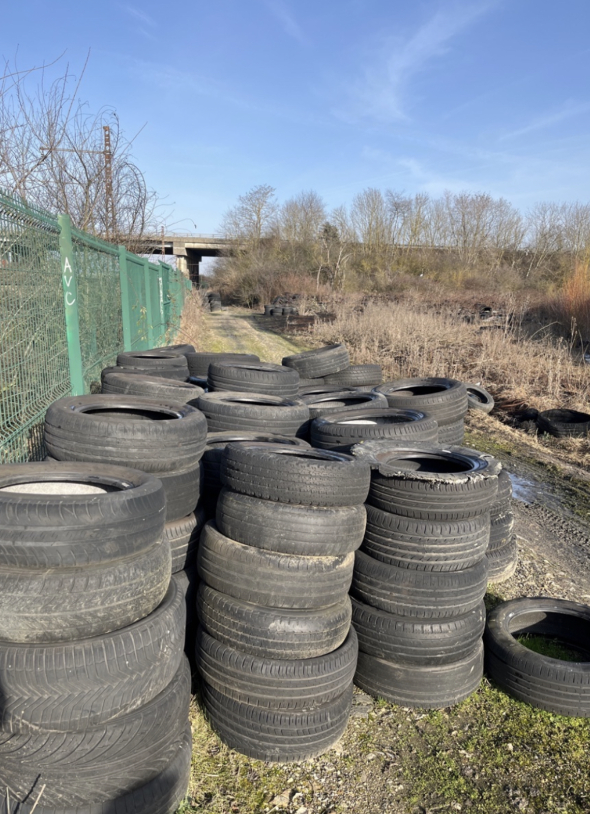 De nombreux pneus ont été déposés illégalement en bordure d'une ligne de chemin de fer