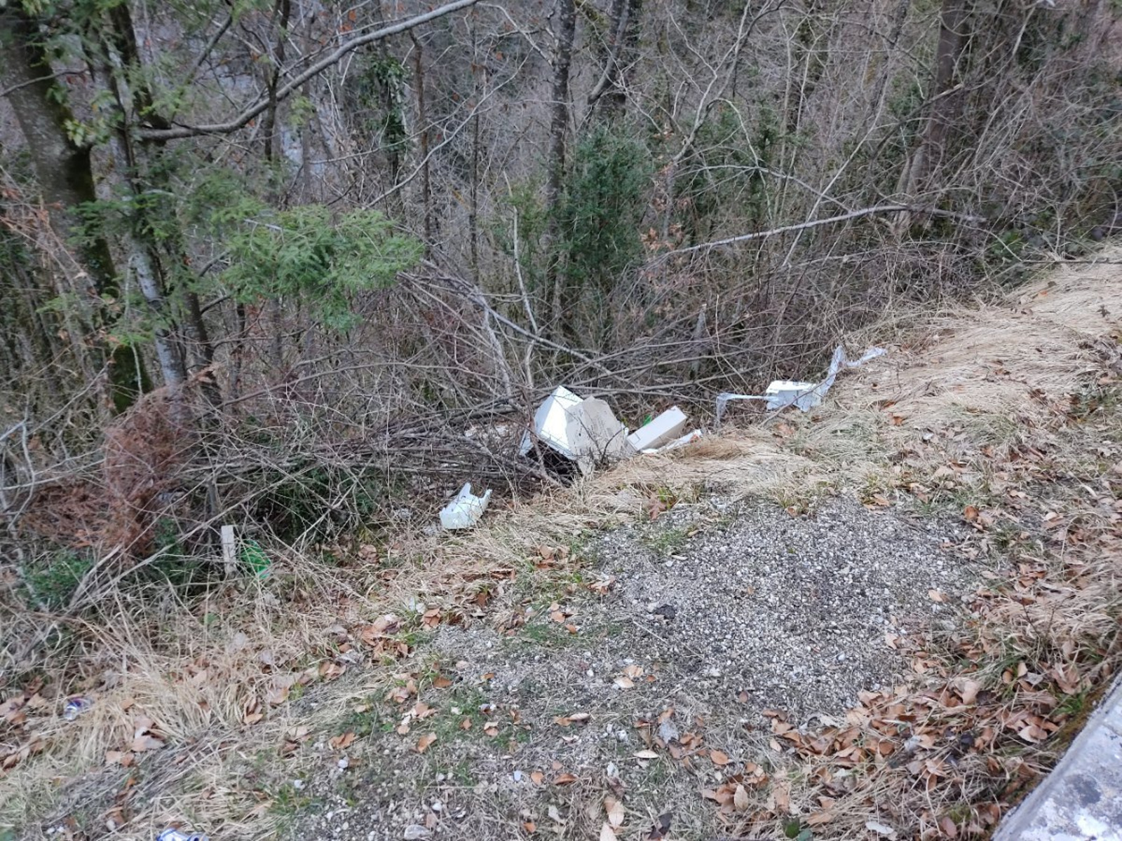 Déchets platiques et métaliques abandonnés depuis la route au dessus des gorges de Chailles.