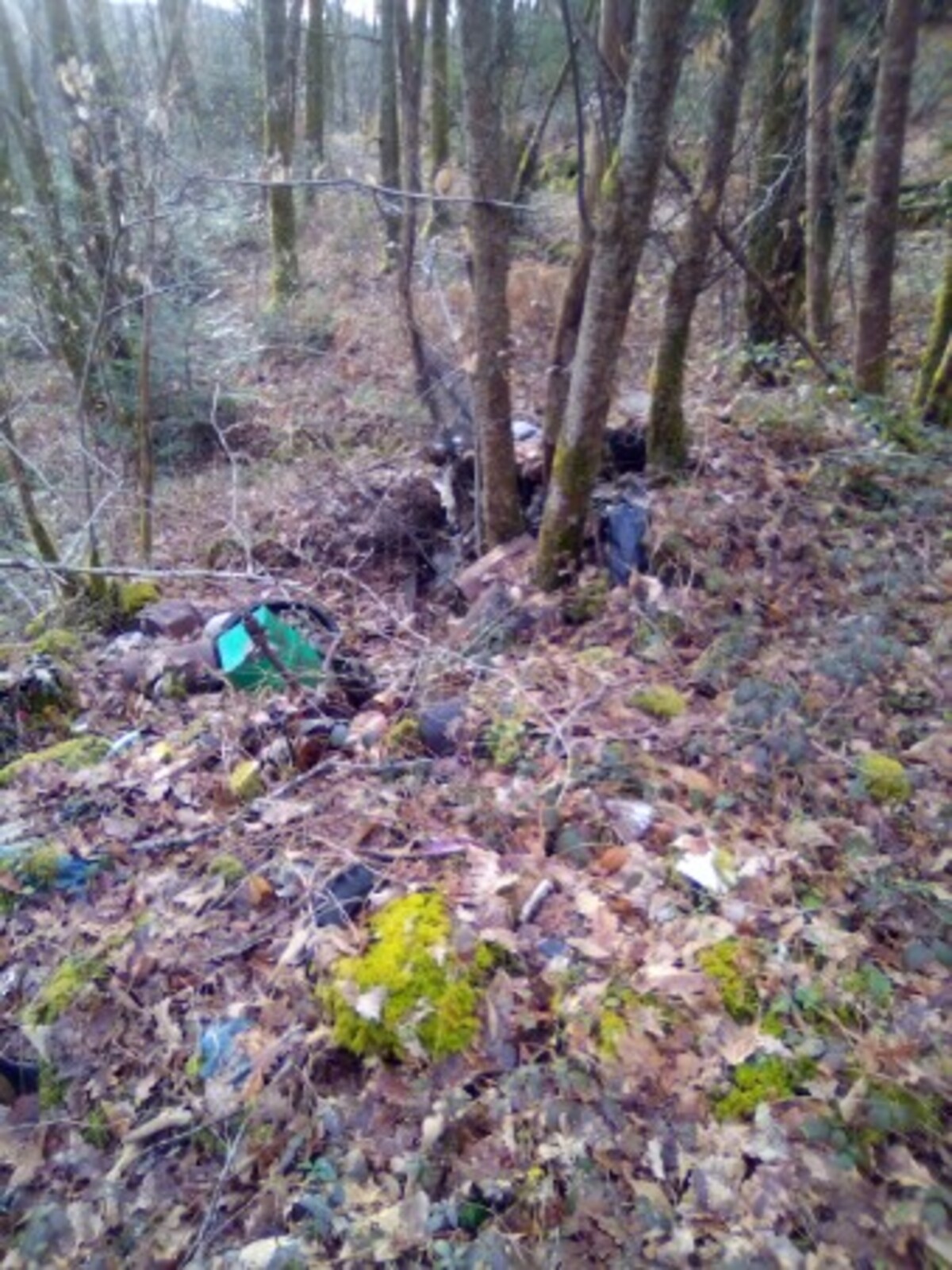 Constat d'un tas d'immondices divers - carcasse d'électro-ménager - bidons d'huile - casques de motos - carcasses de cycles - gros dépôts de ferraille..... une grosse partie camouflée sous des plastiques...