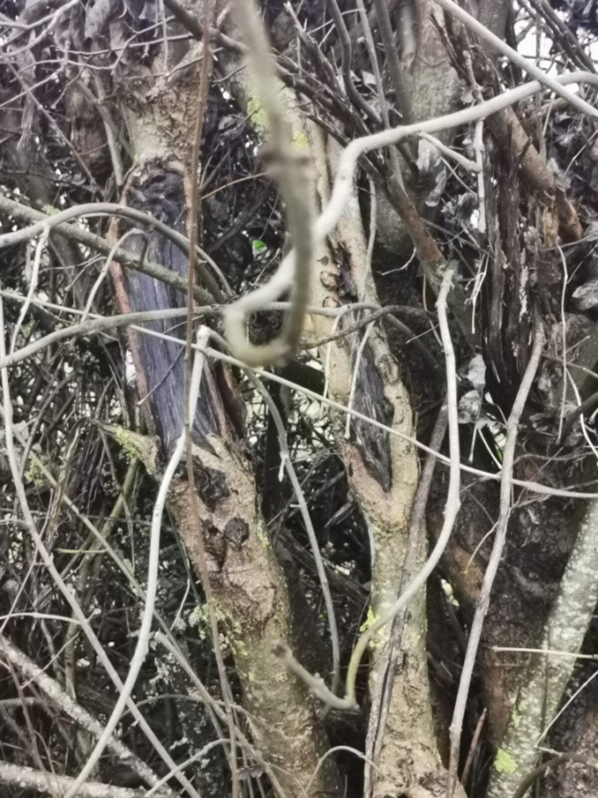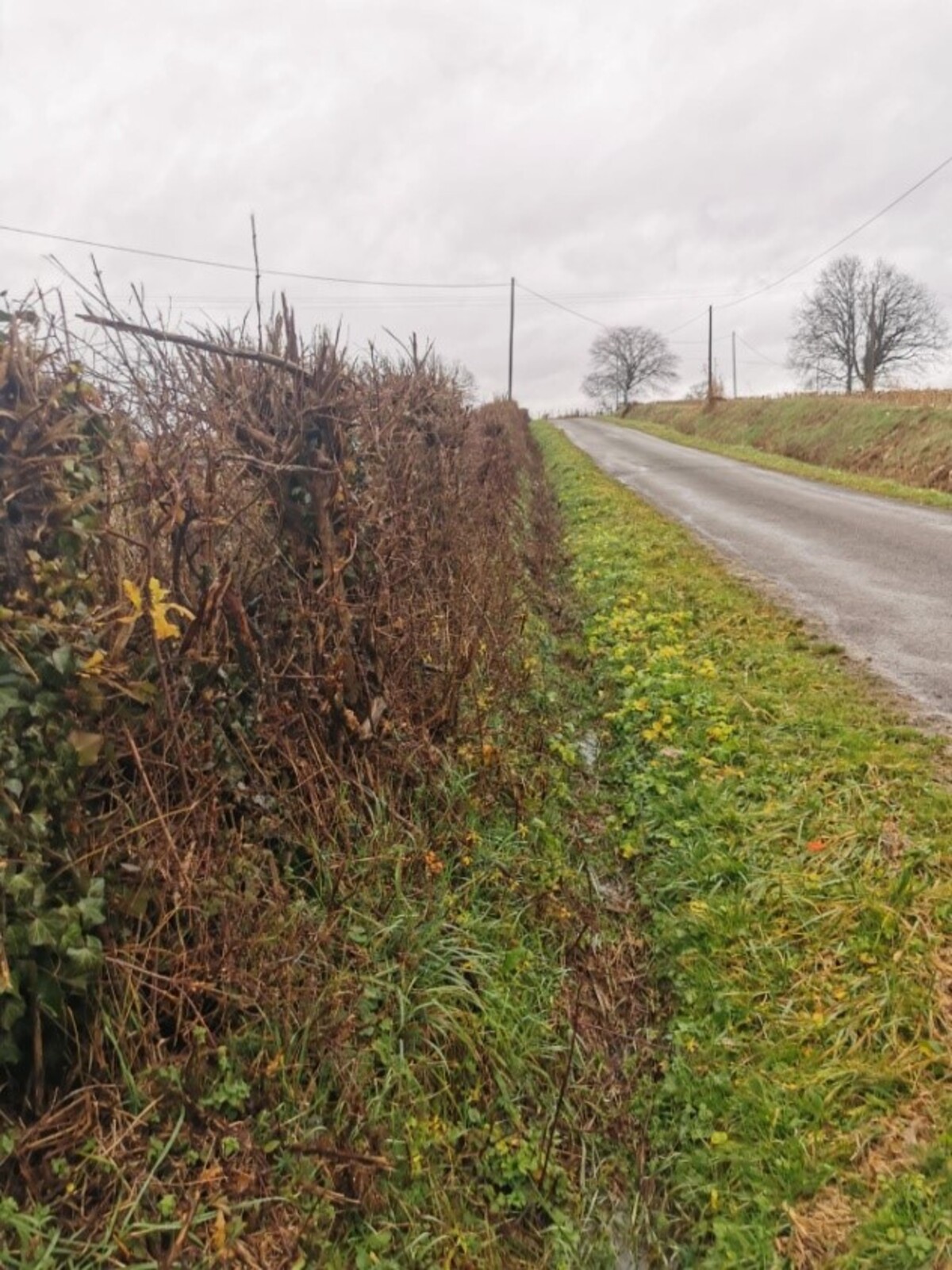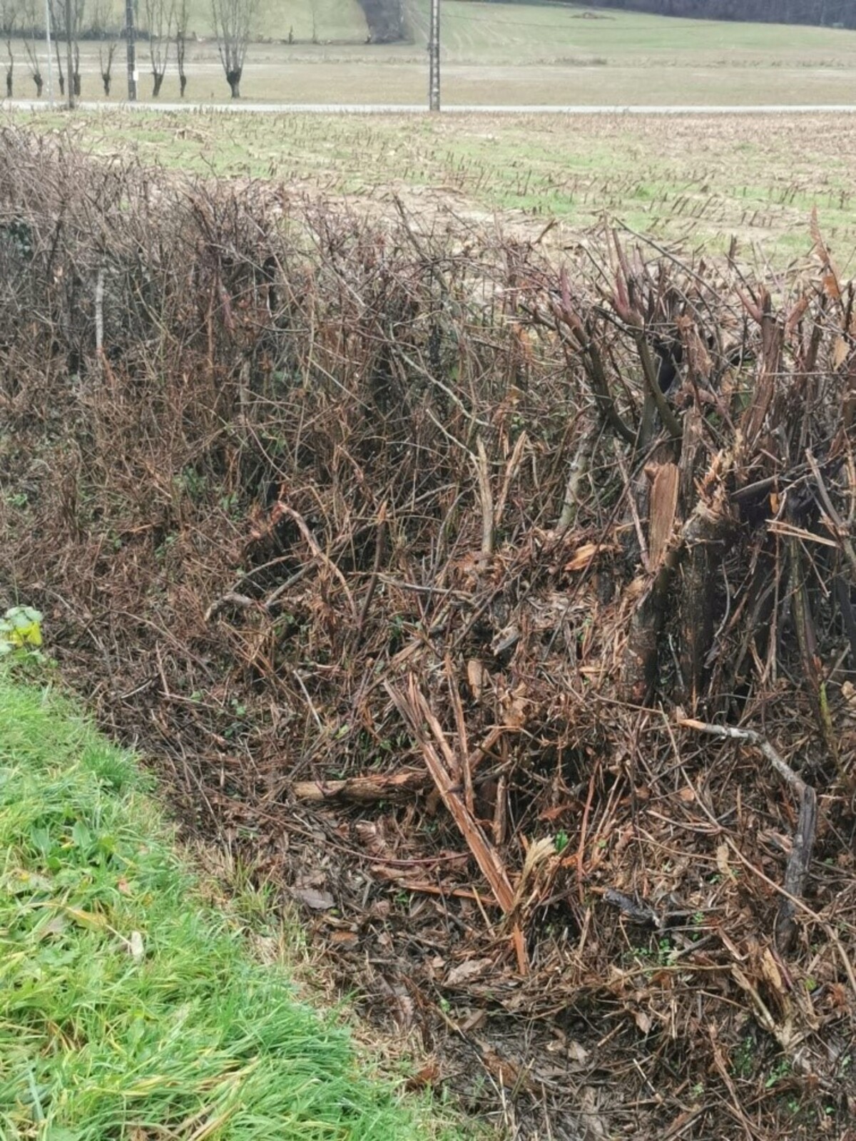 Haie à l'ouest du chemin « des Chaumailles » déchiquetée à l'épareuse, les bois sont éclatés et les arbres blessés
