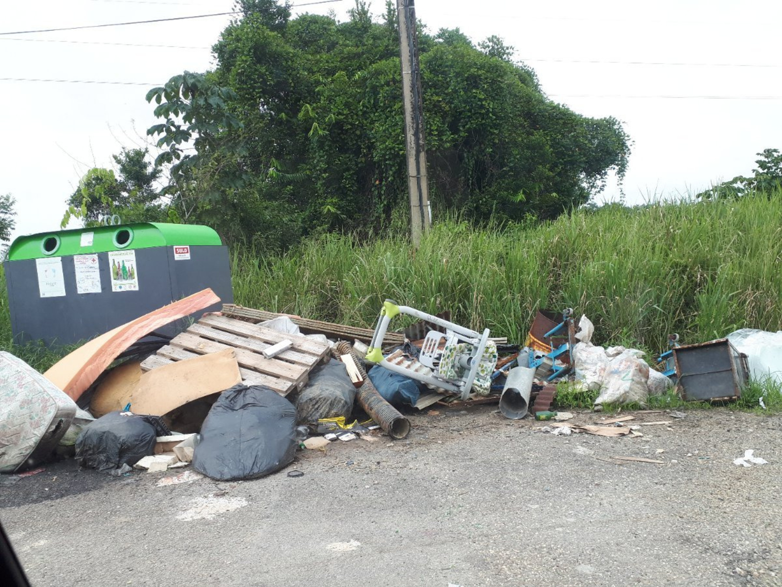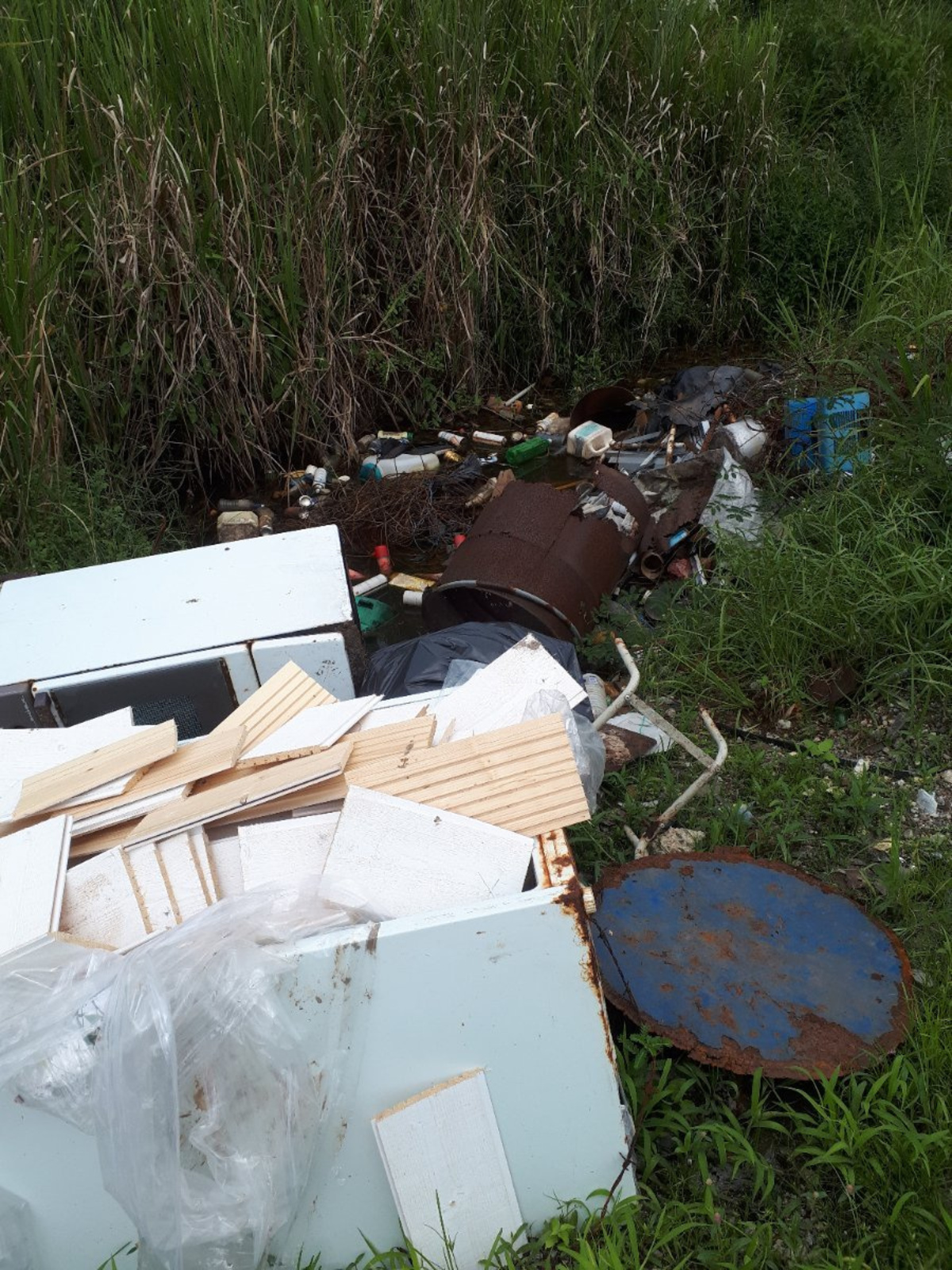 Nature des déchets : encombrants, déchets ménagers, meubles, électroménagers, plastiques, un bidon rouillé