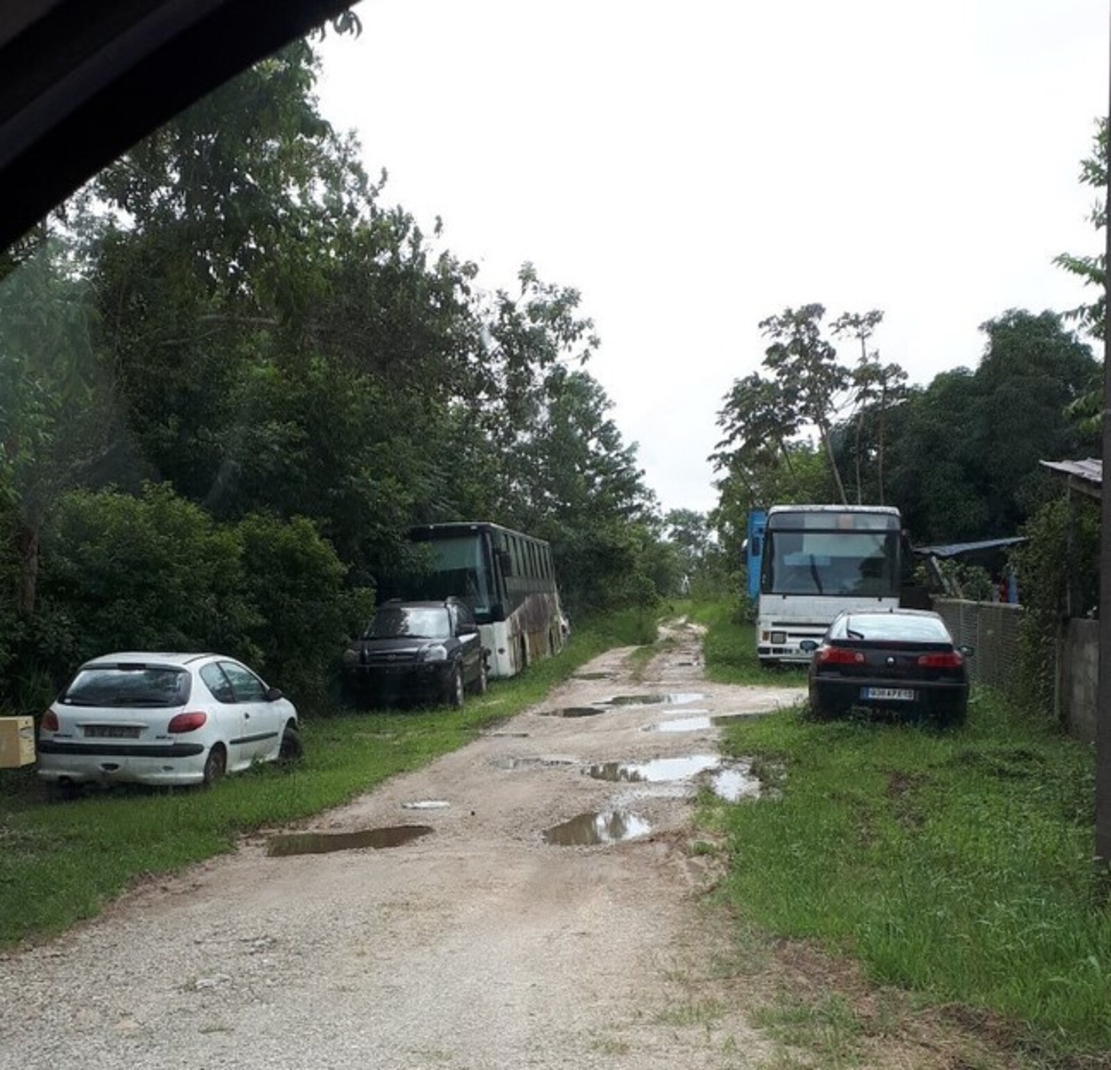 Plusieurs véhicules hors d'usage ont été signalé sur la route Saut Léodate, au niveau d'une voie privée. Ces VHU incluent deux bus et plusieurs véhicules entiers, présentant des signes d'humidité.