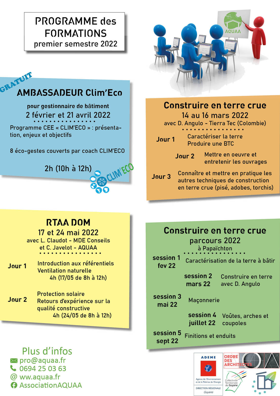 L’association AQUAA animera des formations pour les constructeurs, architectes, bureaux d’étude et aussi les maîtres d’ouvrage et acteurs du secteur du bâtiment en Guyane en 2022.