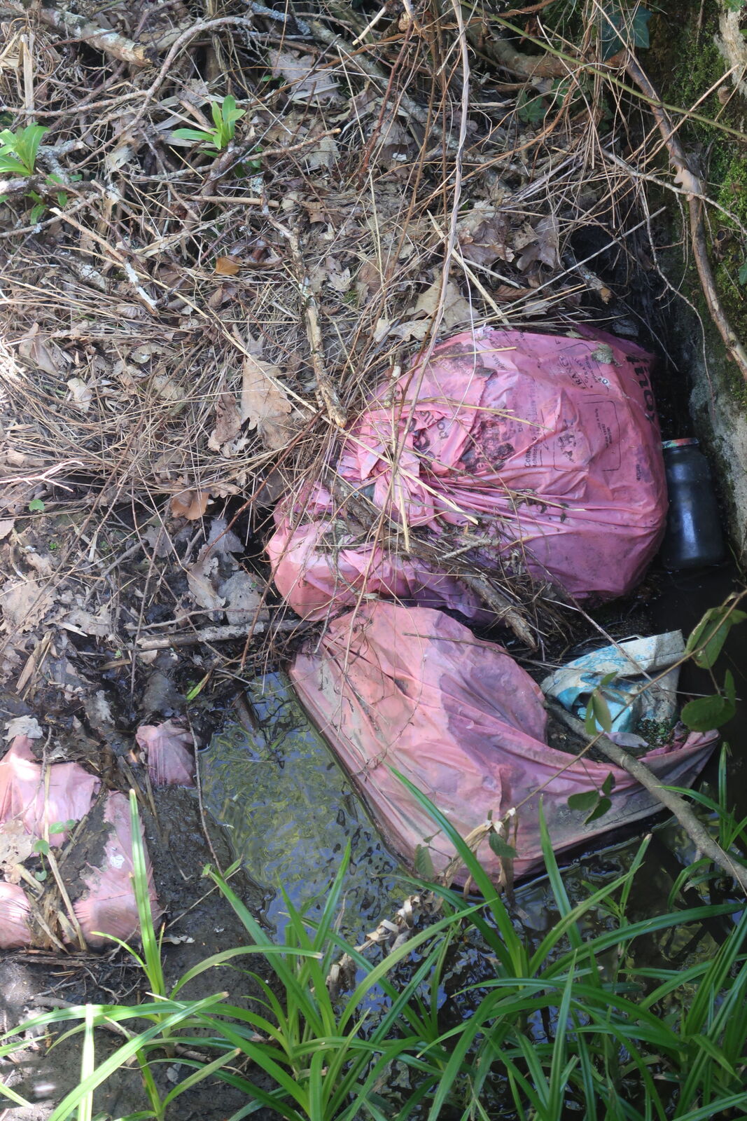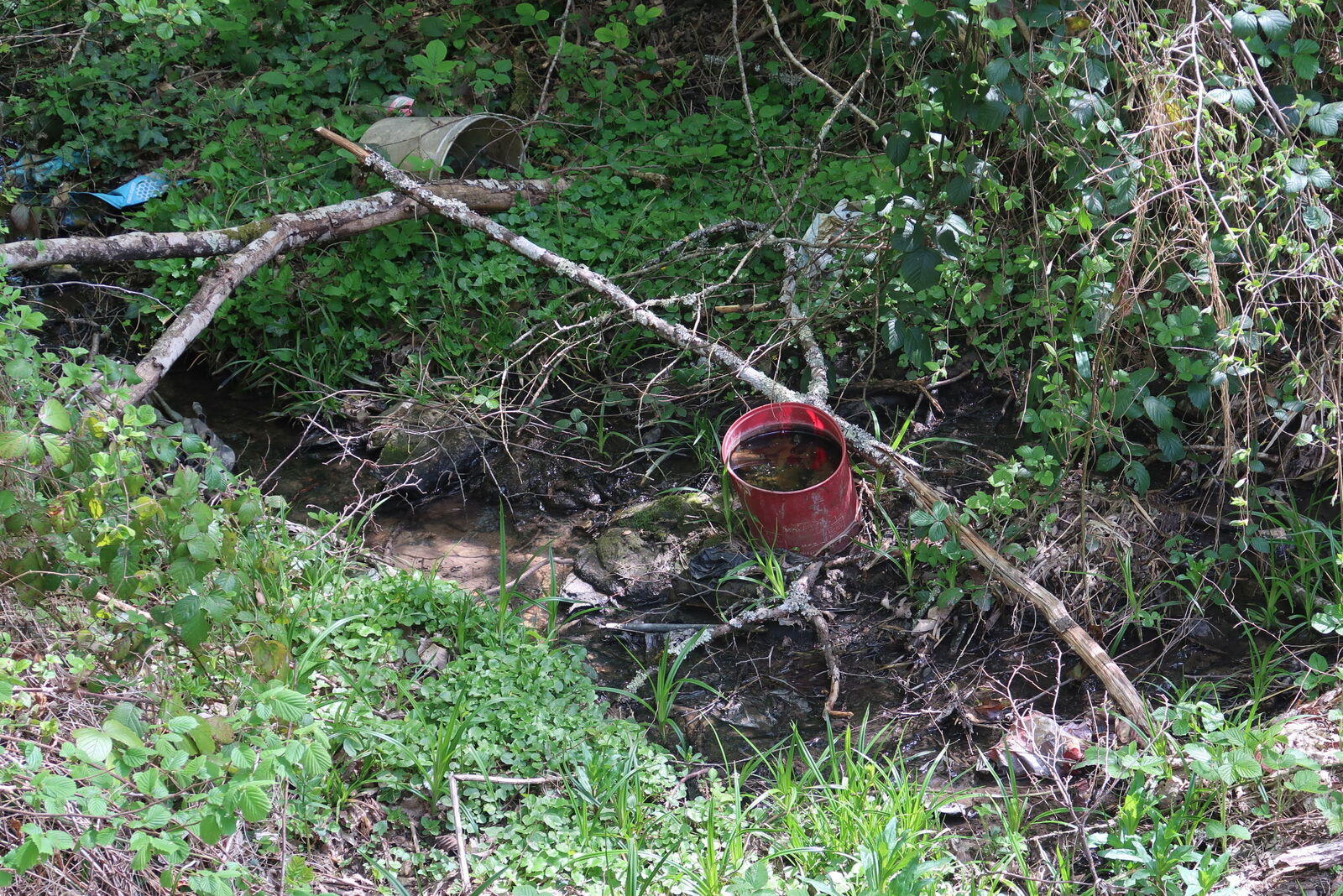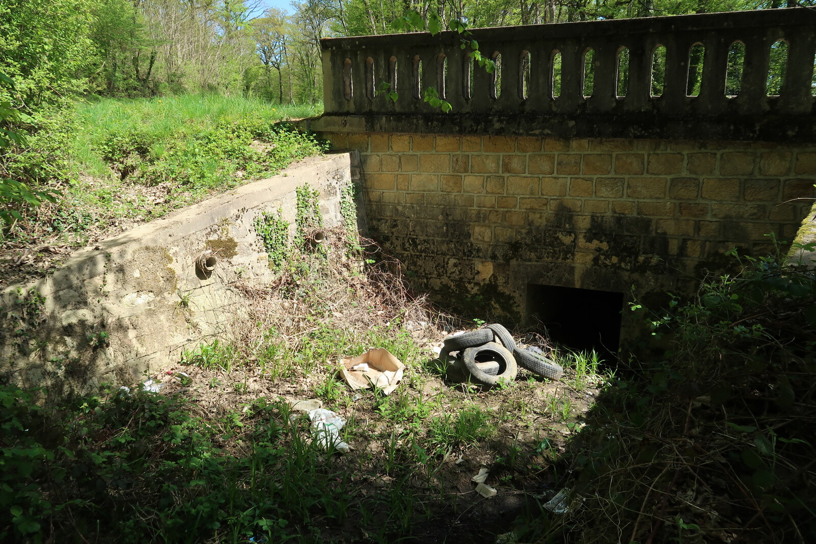 Une grande quantité de déchets a été jetée de part et d'autre d'un pont, dans le lit d'un ruisseau : pneus, bouteilles, sacs et autres objets en plastique... La mairie a été contactée.