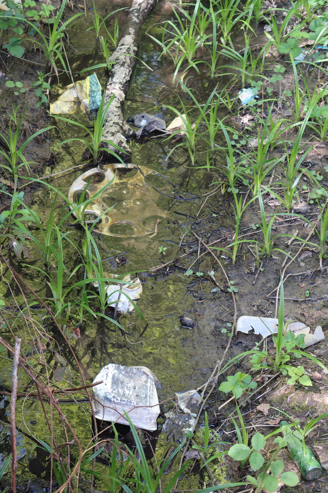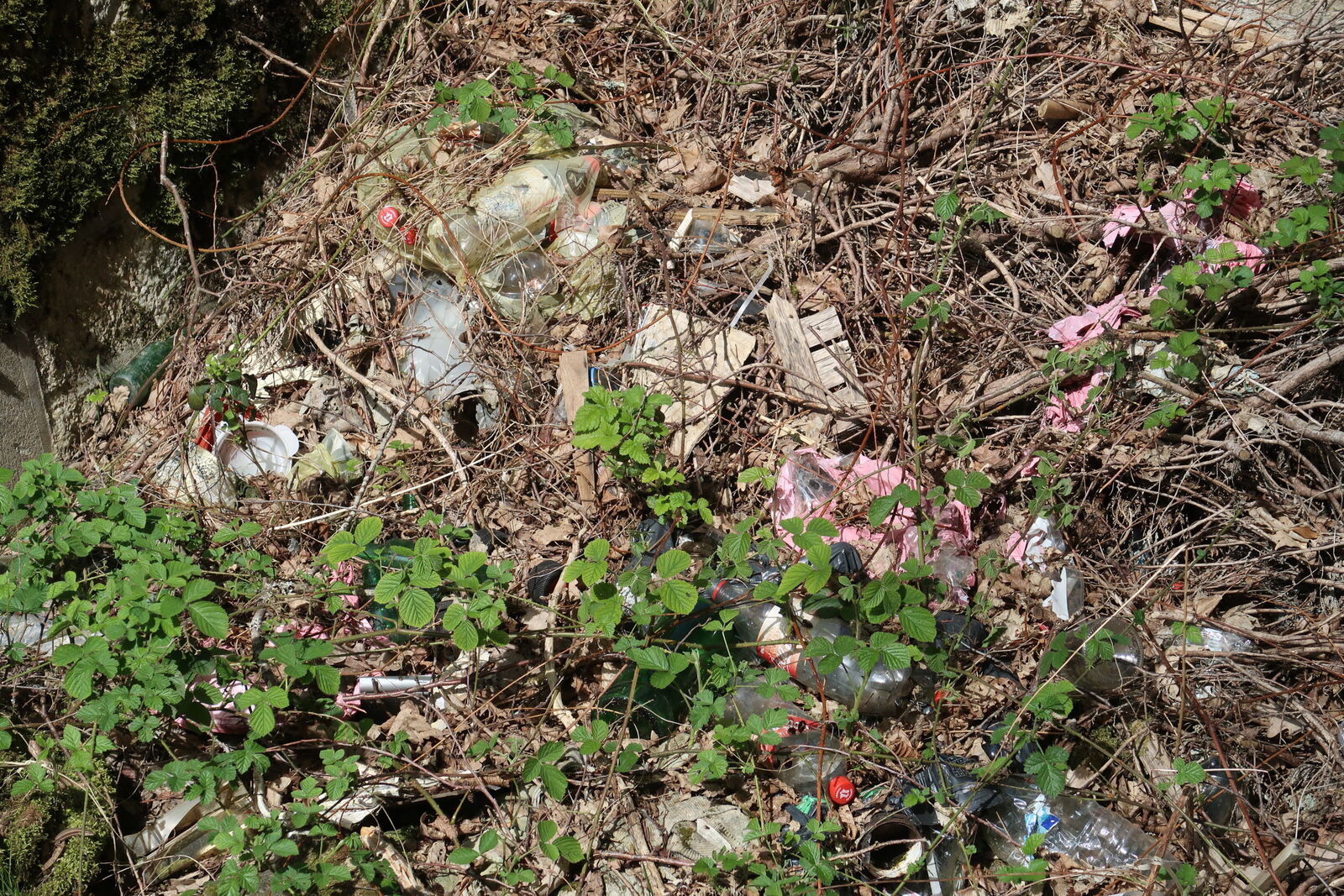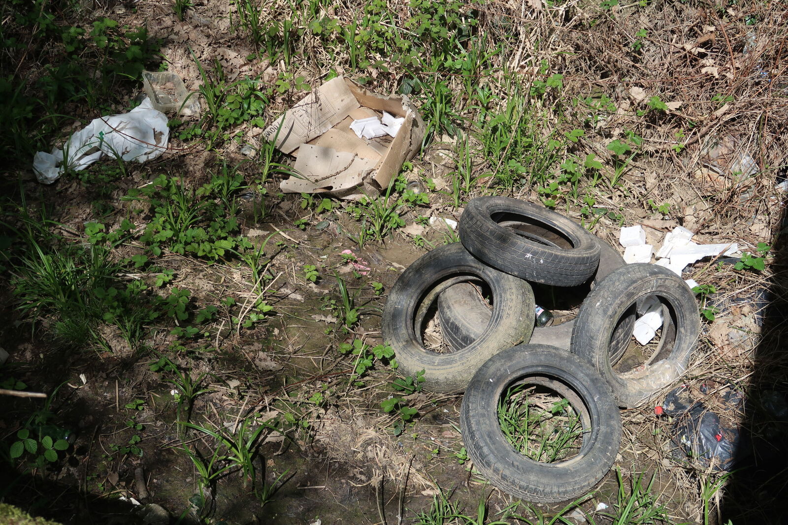 Une grande quantité de déchets a été jetée de part et d'autre d'un pont, dans le lit d'un ruisseau : pneus, bouteilles, sacs et autres objets en plastique... La mairie a été contactée.